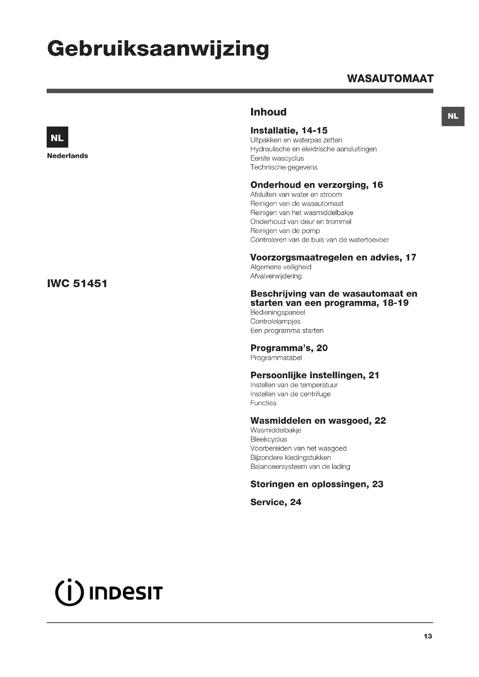 GEBRUIKSAANWIJZING IWC 51451 EU INDESIT