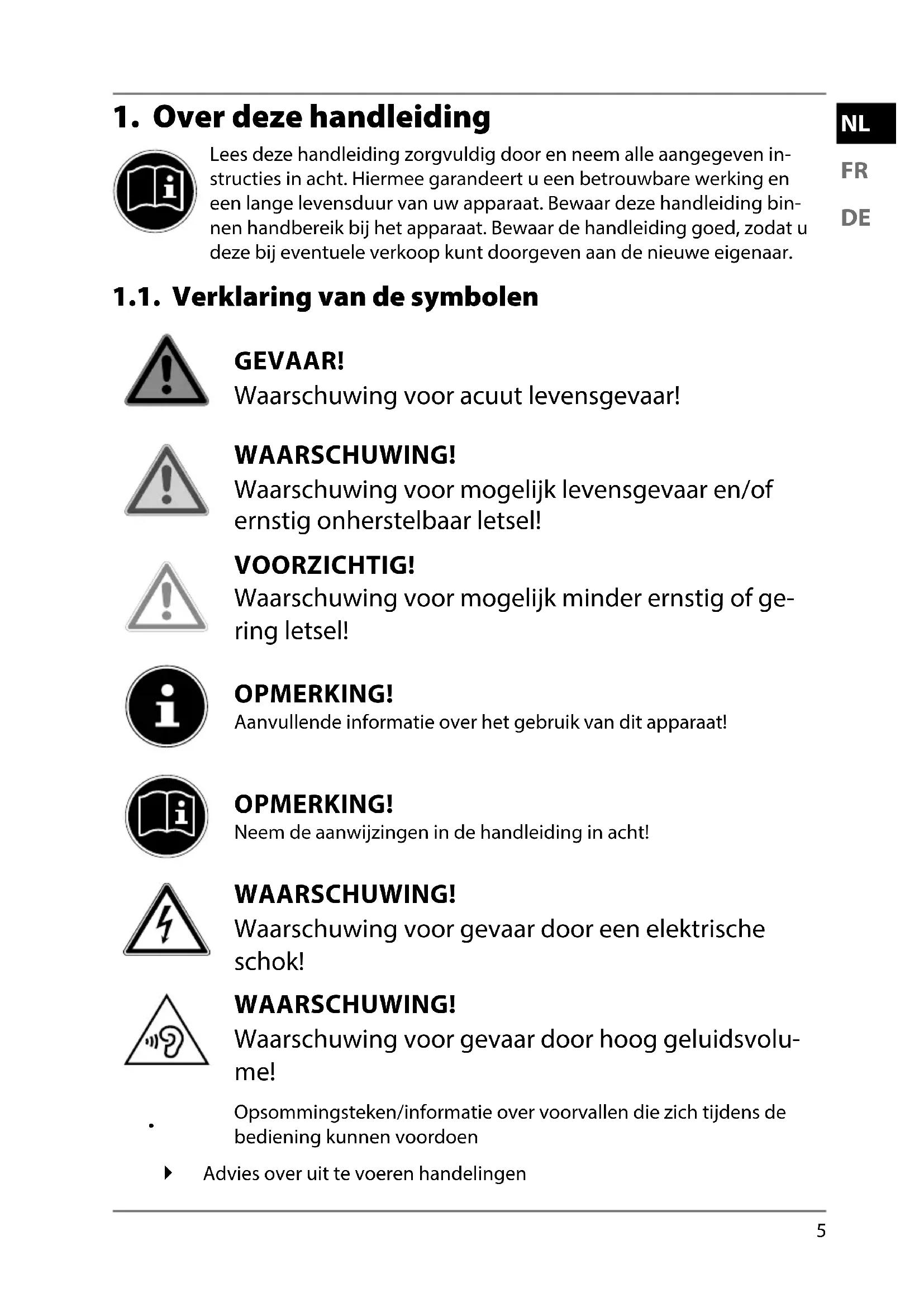 Lees deze handleiding zorgvuldig door en neem alle aangegeven in- structies in acht. Hiermee garandeert u een betrouwbare werking en een lange levensduur van uw apparaat. Bewaar deze handleiding bin- nen handbereik bij het apparaat. Bewaar de handleiding goed, zodat u deze bij eventuele verkoop kunt doorgeven aan de nieuwe eigenaar. 1.1. Verklaring van de symbolen GEVAAR! Waarschuwing voor acuut levensgevaar! WAARSCHUWING! Waarschuwing voor mogelijk levensgevaar en/of ernstig onherstelbaar letsel! VOORZICHTIG! Waarschuwing voor mogelijk minder ernstig of ge- ring letsel! OPMERKING! Aanvullende informatie over het gebruik van dit apparaat! OPMERKING! Neem de aanwijzingen in de handleiding in acht! WAARSCHUWING! Waarschuwing voor gevaar door een elektrische schok! WAARSCHUWING! Waarschuwing voor gevaar door hoog geluidsvolu- me!