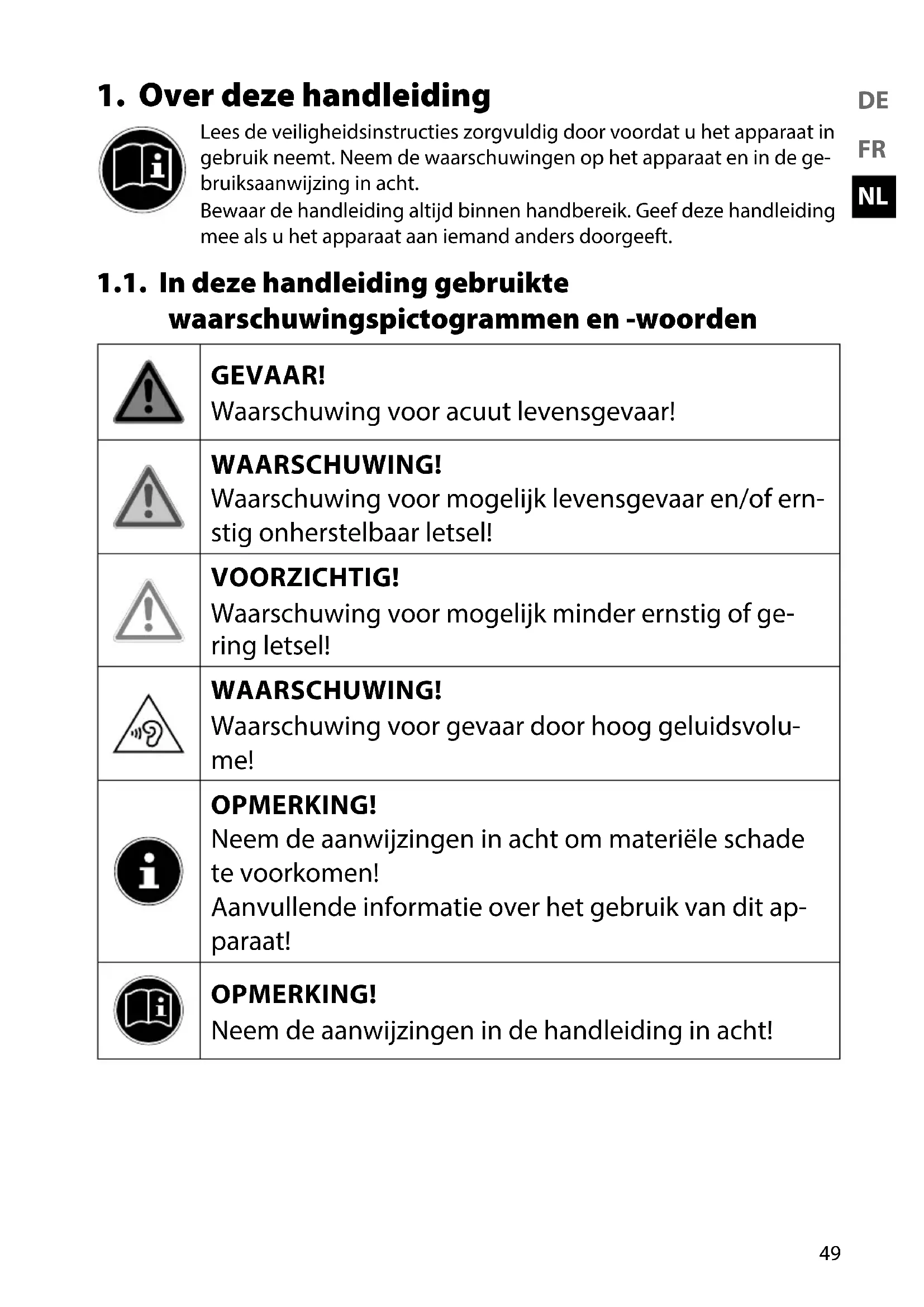 Lees de veiligheidsinstructies zorgvuldig door voordat u het apparaat in gebruik neemt. Neem de waarschuwingen op het apparaat en in de ge- bruiksaanwijzing in acht. Bewaar de handleiding altijd binnen handbereik. Geef deze handleiding mee als u het apparaat aan iemand anders doorgeeft. 1.1. In deze handleiding gebruikte waarschuwingspictogrammen en -woorden GEVAAR! Waarschuwing voor acuut levensgevaar! WAARSCHUWING! Waarschuwing voor mogelijk levensgevaar en/of ern- stig onherstelbaar letsel! VOORZICHTIG! Waarschuwing voor mogelijk minder ernstig of ge- ring letsel! WAARSCHUWING! Waarschuwing voor gevaar door hoog geluidsvolu- me! OPMERKING! Neem de aanwijzingen in acht om materiële schade te voorkomen! Aanvullende informatie over het gebruik van dit ap- paraat! OPMERKING! Neem de aanwijzingen in de handleiding in acht!50