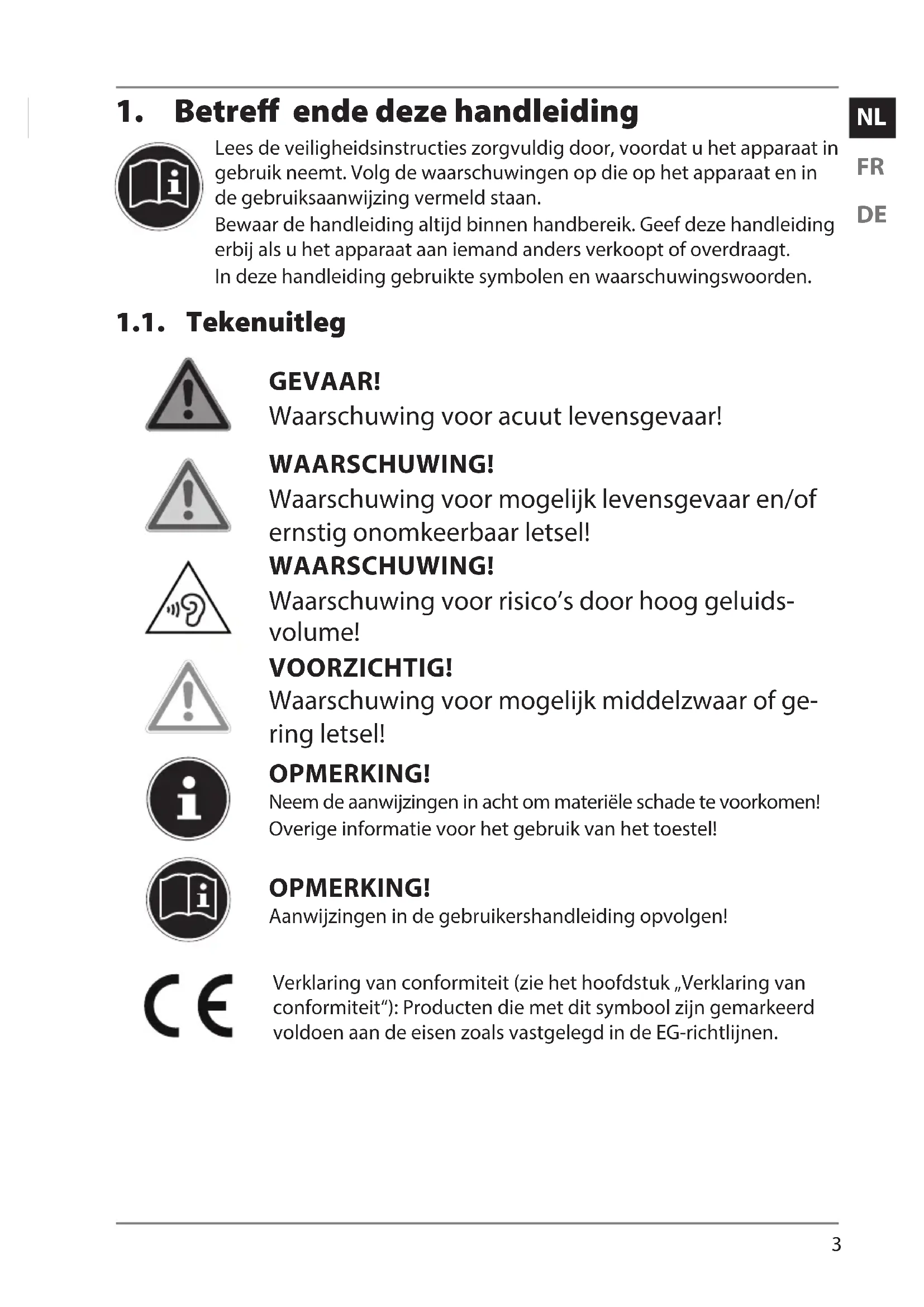 Lees de veiligheidsinstructies zorgvuldig door, voordat u het apparaat in gebruik neemt. Volg de waarschuwingen op die op het apparaat en in de gebruiksaanwijzing vermeld staan. Bewaar de handleiding altijd binnen handbereik. Geef deze handleiding erbij als u het apparaat aan iemand anders verkoopt of overdraagt. In deze handleiding gebruikte symbolen en waarschuwingswoorden. 1.1. Tekenuitleg GEVAAR! Waarschuwing voor acuut levensgevaar! WAARSCHUWING! Waarschuwing voor mogelijk levensgevaar en/of ernstig onomkeerbaar letsel! WAARSCHUWING! Waarschuwing voor risico’s door hoog geluids- volume! VOORZICHTIG! Waarschuwing voor mogelijk middelzwaar of ge- ring letsel! OPMERKING! Neem de aanwijzingen in acht om materiële schade te voorkomen! Overige informatie voor het gebruik van het toestel! OPMERKING! Aanwijzingen in de gebruikershandleiding opvolgen! Verklaring van conformiteit (zie het hoofdstuk „Verklaring van conformiteit“): Producten die met dit symbool zijn gemarkeerd voldoen aan de eisen zoals vastgelegd in de EG-richtlijnen.4 1.2. Gebruik voor het beoogde doel Dit toestel is bedoeld voor het gebruik, het beheer en het be- werken van elektronische documenten en multimedia-inhoud en voor digitale communicatie. Het toestel is alleen bedoeld voor particulier gebruik en is niet geschikt voor industrieel/com- mercieel gebruik. Houd er rekening mee dat de garantie bij een ander dan het be- doelde gebruik komt te vervallen: