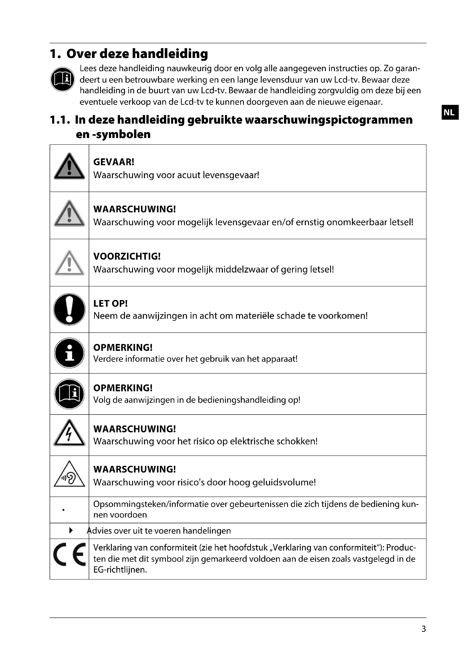 Lees deze handleiding nauwkeurig door en volg alle aangegeven instructies op. Zo garan- deert u een betrouwbare werking en een lange levensduur van uw Lcd-tv. Bewaar deze handleiding in de buurt van uw Lcd-tv. Bewaar de handleiding zorgvuldig om deze bij een eventuele verkoop van de Lcd-tv te kunnen doorgeven aan de nieuwe eigenaar. 1.1. In deze handleiding gebruikte waarschuwingspictogrammen en -symbolen GEVAAR! Waarschuwing voor acuut levensgevaar! WAARSCHUWING! Waarschuwing voor mogelijk levensgevaar en/of ernstig onomkeerbaar letsel! VOORZICHTIG! Waarschuwing voor mogelijk middelzwaar of gering letsel! LET OP! Neem de aanwijzingen in acht om materiële schade te voorkomen! OPMERKING! Verdere informatie over het gebruik van het apparaat! OPMERKING! Volg de aanwijzingen in de bedieningshandleiding op! WAARSCHUWING! Waarschuwing voor het risico op elektrische schokken! WAARSCHUWING! Waarschuwing voor risico's door hoog geluidsvolume!