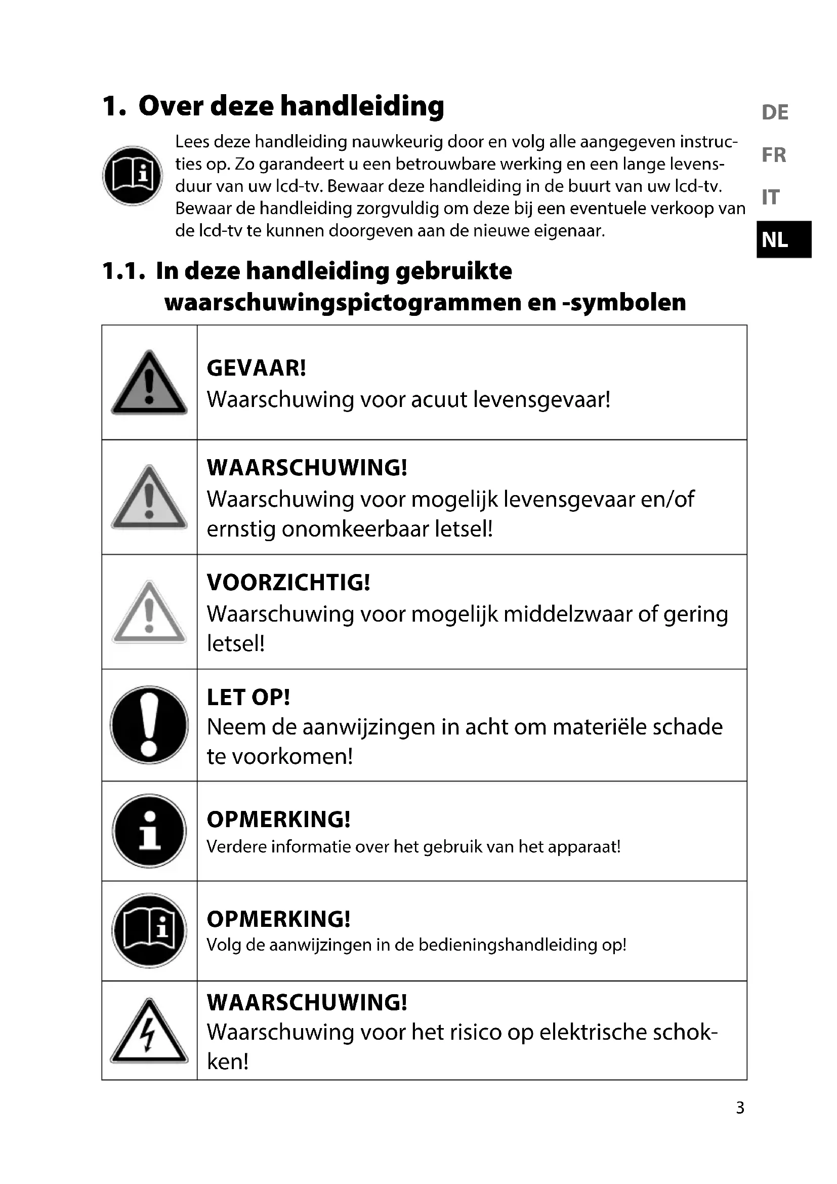 Lees deze handleiding nauwkeurig door en volg alle aangegeven instruc- ties op. Zo garandeert u een betrouwbare werking en een lange levens- duur van uw lcd-tv. Bewaar deze handleiding in de buurt van uw lcd-tv. Bewaar de handleiding zorgvuldig om deze bij een eventuele verkoop van de lcd-tv te kunnen doorgeven aan de nieuwe eigenaar. 1.1. In deze handleiding gebruikte waarschuwingspictogrammen en -symbolen GEVAAR! Waarschuwing voor acuut levensgevaar! WAARSCHUWING! Waarschuwing voor mogelijk levensgevaar en/of ernstig onomkeerbaar letsel! VOORZICHTIG! Waarschuwing voor mogelijk middelzwaar of gering letsel! LET OP! Neem de aanwijzingen in acht om materiële schade te voorkomen! OPMERKING! Verdere informatie over het gebruik van het apparaat! OPMERKING! Volg de aanwijzingen in de bedieningshandleiding op! WAARSCHUWING! Waarschuwing voor het risico op elektrische schok- ken!4 WAARSCHUWING! Waarschuwing voor risico's door hoog geluidsvolu- me!