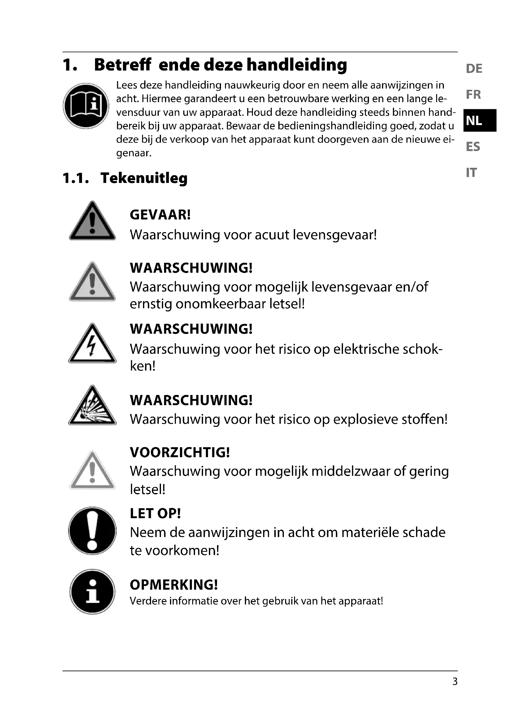 Lees deze handleiding nauwkeurig door en neem alle aanwijzingen in acht. Hiermee garandeert u een betrouwbare werking en een lange le- vensduur van uw apparaat. Houd deze handleiding steeds binnen hand- bereik bij uw apparaat. Bewaar de bedieningshandleiding goed, zodat u deze bij de verkoop van het apparaat kunt doorgeven aan de nieuwe ei- genaar. 1.1. Tekenuitleg GEVAAR! Waarschuwing voor acuut levensgevaar! WAARSCHUWING! Waarschuwing voor mogelijk levensgevaar en/of ernstig onomkeerbaar letsel! WAARSCHUWING! Waarschuwing voor het risico op elektrische schok- ken! WAARSCHUWING! Waarschuwing voor het risico op explosieve stoffen! VOORZICHTIG! Waarschuwing voor mogelijk middelzwaar of gering letsel! LET OP! Neem de aanwijzingen in acht om materiële schade te voorkomen! OPMERKING! Verdere informatie over het gebruik van het apparaat! 18004 MULI-WE MSN 5005 6215 Content final.indb 318004 MULI-WE MSN 5005 6215 Content final.indb 3 09.08.2017 13:30:2009.08.2017 13:30:204 OPMERKING! Volg de aanwijzingen in de bedieningshandleiding op!