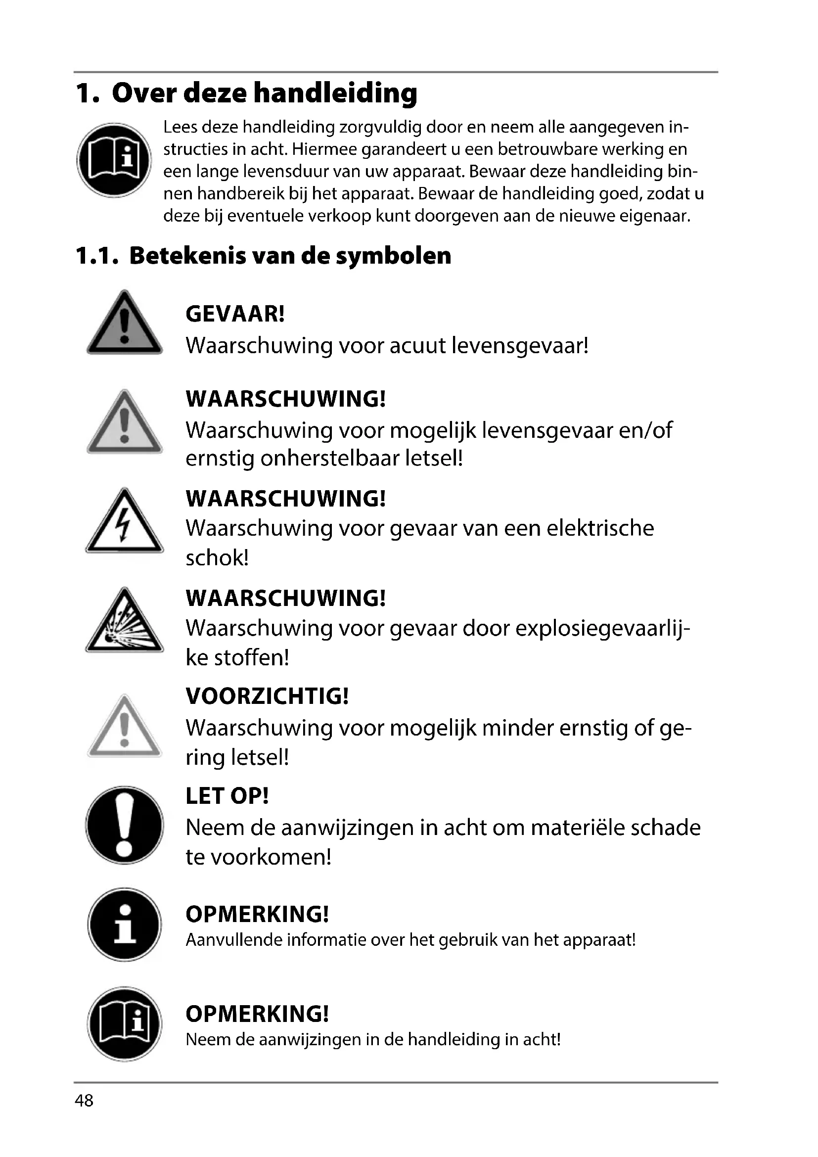 Lees deze handleiding zorgvuldig door en neem alle aangegeven in- structies in acht. Hiermee garandeert u een betrouwbare werking en een lange levensduur van uw apparaat. Bewaar deze handleiding bin- nen handbereik bij het apparaat. Bewaar de handleiding goed, zodat u deze bij eventuele verkoop kunt doorgeven aan de nieuwe eigenaar. 1.1. Betekenis van de symbolen GEVAAR! Waarschuwing voor acuut levensgevaar! WAARSCHUWING! Waarschuwing voor mogelijk levensgevaar en/of ernstig onherstelbaar letsel! WAARSCHUWING! Waarschuwing voor gevaar van een elektrische schok! WAARSCHUWING! Waarschuwing voor gevaar door explosiegevaarlij- ke stoffen! VOORZICHTIG! Waarschuwing voor mogelijk minder ernstig of ge- ring letsel! LET OP! Neem de aanwijzingen in acht om materiële schade te voorkomen! OPMERKING! Aanvullende informatie over het gebruik van het apparaat! OPMERKING! Neem de aanwijzingen in de handleiding in acht!49
