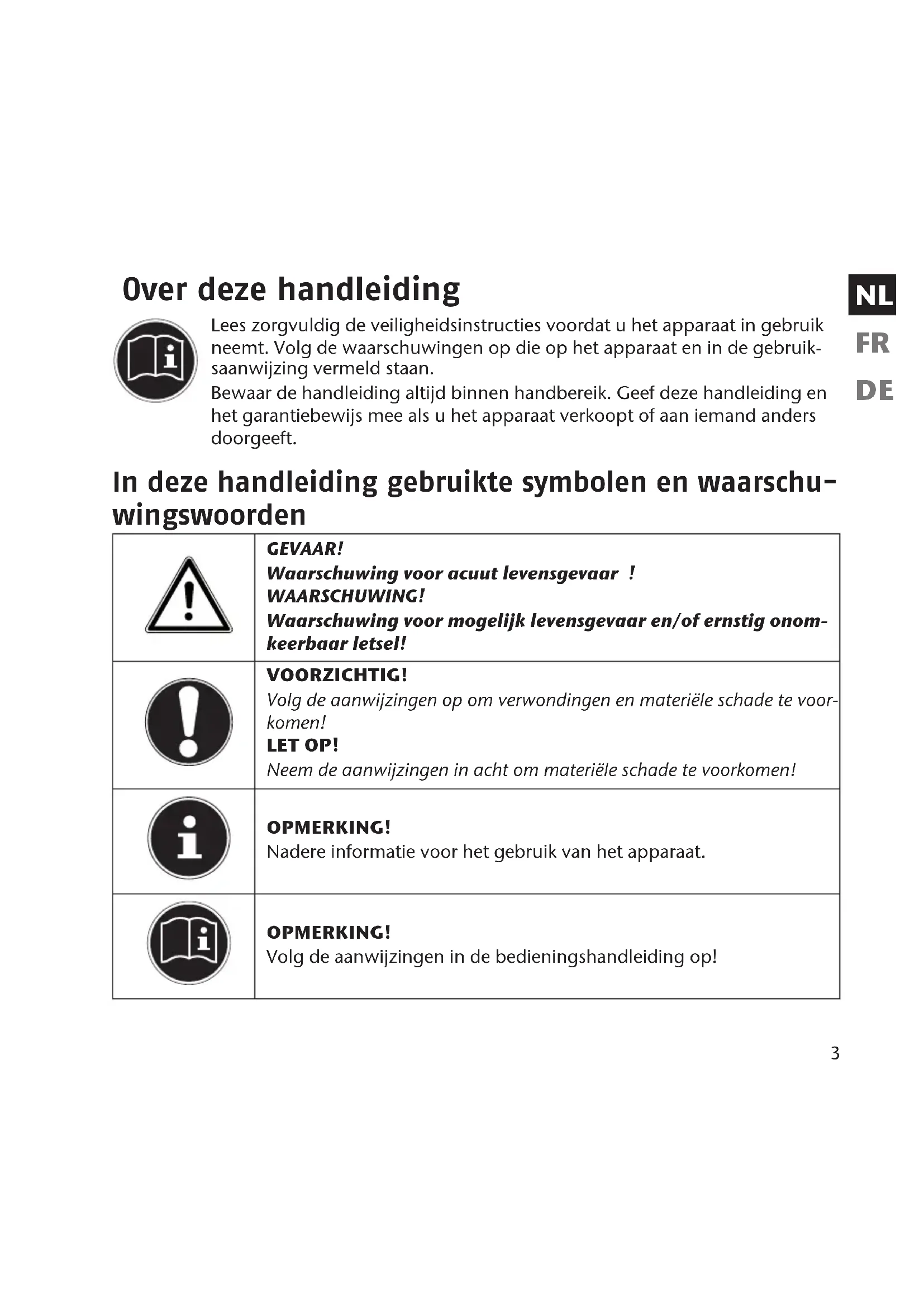 Over deze handleiding Lees zorgvuldig de veiligheidsinstructies voordat u het apparaat in gebruik neemt. Volg de waarschuwingen op die op het apparaat en in de gebruik- saanwijzing vermeld staan. Bewaar de handleiding altijd binnen handbereik. Geef deze handleiding en het garantiebewijs mee als u het apparaat verkoopt of aan iemand anders doorgeeft. In deze handleiding gebruikte symbolen en waarschu- wingswoorden GEVAAR! Waarschuwing voor acuut levensgevaar ! WAARSCHUWING! Waarschuwing voor mogelijk levensgevaar en/of ernstig onom- keerbaar letsel! VOORZICHTIG! Volg de aanwijzingen op om verwondingen en materiële schade te voor- komen! LET OP! Neem de aanwijzingen in acht om materiële schade te voorkomen! OPMERKING! Nadere informatie voor het gebruik van het apparaat. OPMERKING! Volg de aanwijzingen in de bedieningshandleiding op! 86423 BE ALDI BE Content RC1.indb 386423 BE ALDI BE Content RC1.indb 3 20.09.2012 15:17:5020.09.2012 15:17:504 WAARSCHUWING! Waarschuwing voor het risico op elektrische schokken!