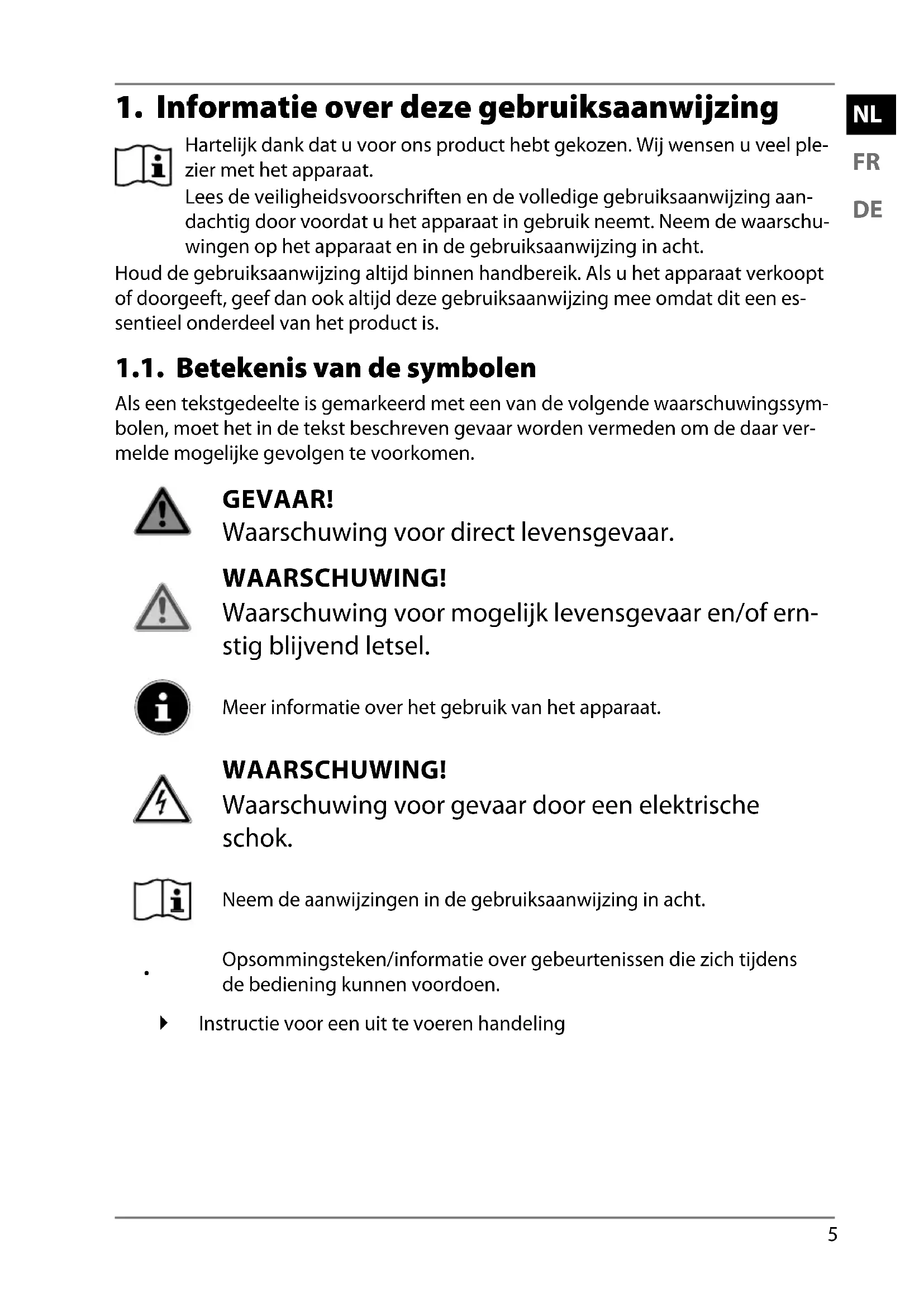 Hartelijk dank dat u voor ons product hebt gekozen. Wij wensen u veel ple- zier met het apparaat. Lees de veiligheidsvoorschriften en de volledige gebruiksaanwijzing aan- dachtig door voordat u het apparaat in gebruik neemt. Neem de waarschu- wingen op het apparaat en in de gebruiksaanwijzing in acht. Houd de gebruiksaanwijzing altijd binnen handbereik. Als u het apparaat verkoopt of doorgeeft, geef dan ook altijd deze gebruiksaanwijzing mee omdat dit een es- sentieel onderdeel van het product is. 1.1. Betekenis van de symbolen Als een tekstgedeelte is gemarkeerd met een van de volgende waarschuwingssym- bolen, moet het in de tekst beschreven gevaar worden vermeden om de daar ver- melde mogelijke gevolgen te voorkomen. GEVAAR! Waarschuwing voor direct levensgevaar. WAARSCHUWING! Waarschuwing voor mogelijk levensgevaar en/of ern- stig blijvend letsel. Meer informatie over het gebruik van het apparaat. WAARSCHUWING! Waarschuwing voor gevaar door een elektrische schok. Neem de aanwijzingen in de gebruiksaanwijzing in acht.