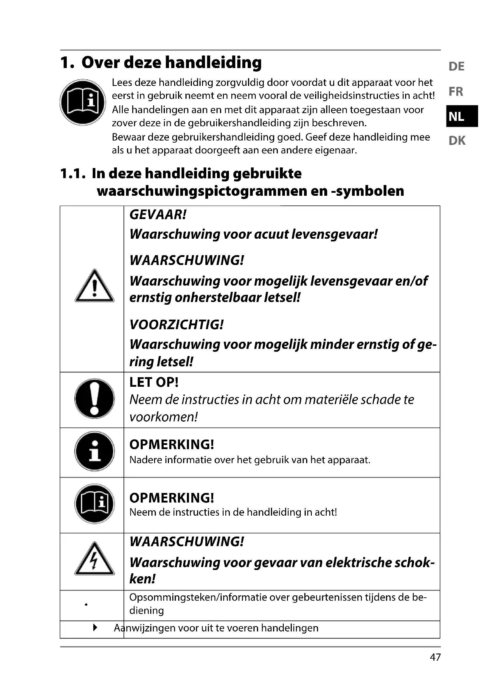 Lees deze handleiding zorgvuldig door voordat u dit apparaat voor het eerst in gebruik neemt en neem vooral de veiligheidsinstructies in acht! Alle handelingen aan en met dit apparaat zijn alleen toegestaan voor zover deze in de gebruikershandleiding zijn beschreven. Bewaar deze gebruikershandleiding goed. Geef deze handleiding mee als u het apparaat doorgeeft aan een andere eigenaar. 1.1. In deze handleiding gebruikte waarschuwingspictogrammen en -symbolen GEVAAR! Waarschuwing voor acuut levensgevaar! WAARSCHUWING! Waarschuwing voor mogelijk levensgevaar en/of ernstig onherstelbaar letsel! VOORZICHTIG! Waarschuwing voor mogelijk minder ernstig of ge- ring letsel! LET OP! Neem de instructies in acht om materiële schade te voorkomen! OPMERKING! Nadere informatie over het gebruik van het apparaat. OPMERKING! Neem de instructies in de handleiding in acht! WAARSCHUWING! Waarschuwing voor gevaar van elektrische schok- ken!