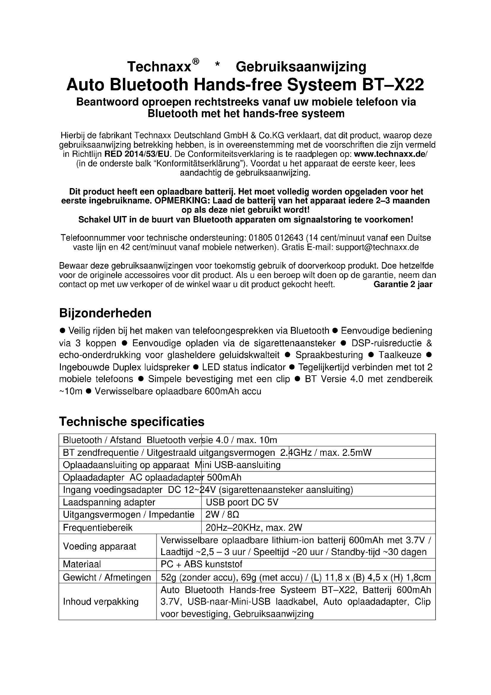 - Gebruiksaanwijzing Auto Bluetooth Hands-free Systeem BT–X22 Beantwoord oproepen rechtstreeks vanaf uw mobiele telefoon via Bluetooth met het hands-free systeem Hierbij de fabrikant Technaxx Deutschland GmbH & Co.KG verklaart, dat dit product, waarop deze gebruiksaanwijzing betrekking hebben, is in overeenstemming met de voorschriften die zijn vermeld in Richtlijn RED 2014/53/EU. De Conformiteitsverklaring is te raadplegen op: www.technaxx.de/ (in de onderste balk “Konformitätserklärung”). Voordat u het apparaat de eerste keer, lees aandachtig de gebruiksaanwijzing. Dit product heeft een oplaadbare batterij. Het moet volledig worden opgeladen voor het eerste ingebruikname. OPMERKING: Laad de batterij van het apparaat iedere 2–3 maanden op als deze niet gebruikt wordt! Schakel UIT in de buurt van Bluetooth apparaten om signaalstoring te voorkomen! Telefoonnummer voor technische ondersteuning: 01805 012643 (14 cent/minuut vanaf een Duitse vaste lijn en 42 cent/minuut vanaf mobiele netwerken). Gratis E-mail: support@technaxx.de Bewaar deze gebruiksaanwijzingen voor toekomstig gebruik of doorverkoop produkt. Doe hetzelfde voor de originele accessoires voor dit product. Als u een beroep wilt doen op de garantie, neem dan contact op met uw verkoper of de winkel waar u dit product gekocht heeft. Garantie 2 jaar Bijzonderheden Veilig rijden bij het maken van telefoongesprekken via Bluetooth Eenvoudige bediening via 3 koppen Eenvoudige opladen via de sigarettenaansteker DSP-ruisreductie & echo-onderdrukking voor glasheldere geluidskwalteit Spraakbesturing Taalkeuze Ingebouwde Duplex luidspreker LED status indicator Tegelijkertijd verbinden met tot 2 mobiele telefoons Simpele bevestiging met een clip BT Versie 4.0 met zendbereik ~10m Verwisselbare oplaadbare 600mAh accu Technische specificaties Bluetooth / Afstand Bluetooth versie 4.0 / max. 10m BT zendfrequentie / Uitgestraald uitgangsvermogen 2.4GHz / max. 2.5mW Oplaadaansluiting op apparaat Mini USB-aansluiting Oplaadadapter AC oplaadadapter 500mAh Ingang voedingsadapter DC 12~24V (sigarettenaansteker aansluiting) Laadspanning adapter USB poort DC 5V Uitgangsvermogen / Impedantie 2W / 8Ω Frequentiebereik 20Hz–20KHz, max. 2W Voeding apparaat Verwisselbare oplaadbare lithium-ion batterij 600mAh met 3.7V / Laadtijd ~2,5 – 3 uur / Speeltijd ~20 uur / Standby-tijd ~30 dagen Materiaal PC + ABS kunststof Gewicht / Afmetingen 52g (zonder accu), 69g (met accu) / (L) 11,8 x (B) 4,5 x (H) 1,8cm