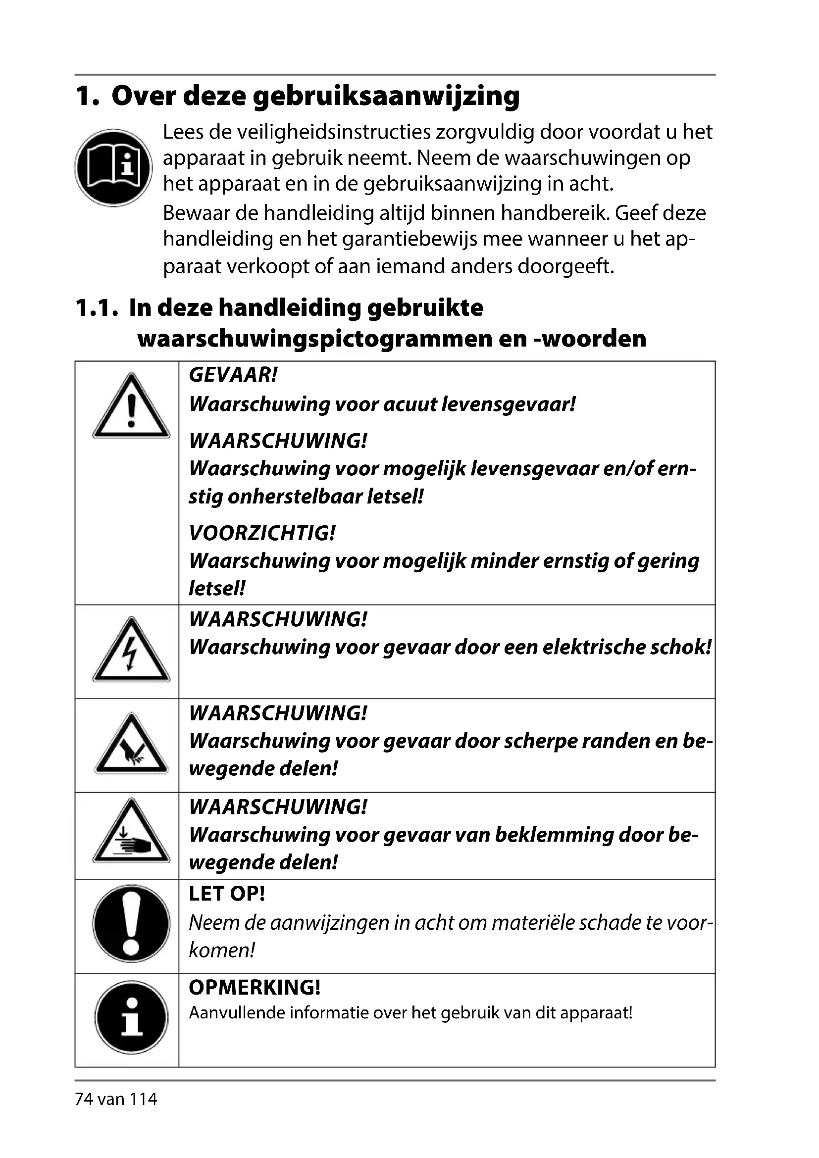 Lees de veiligheidsinstructies zorgvuldig door voordat u het apparaat in gebruik neemt. Neem de waarschuwingen op het apparaat en in de gebruiksaanwijzing in acht. Bewaar de handleiding altijd binnen handbereik. Geef deze handleiding en het garantiebewijs mee wanneer u het ap- paraat verkoopt of aan iemand anders doorgeeft. 1.1. In deze handleiding gebruikte waarschuwingspictogrammen en -woorden GEVAAR! Waarschuwing voor acuut levensgevaar! WAARSCHUWING! Waarschuwing voor mogelijk levensgevaar en/of ern- stig onherstelbaar letsel! VOORZICHTIG! Waarschuwing voor mogelijk minder ernstig of gering letsel! WAARSCHUWING! Waarschuwing voor gevaar door een elektrische schok! WAARSCHUWING! Waarschuwing voor gevaar door scherpe randen en be- wegende delen! WAARSCHUWING! Waarschuwing voor gevaar van beklemming door be- wegende delen! LET OP! Neem de aanwijzingen in acht om materiële schade te voor- komen! OPMERKING! Aanvullende informatie over het gebruik van dit apparaat! 16517 Standmixer DE EN FR NL DK ECommerce Content final.indb 7416517 Standmixer DE EN FR NL DK ECommerce Content final.indb 74 17.09.2015 09:36:2517.09.2015 09:36:25DE