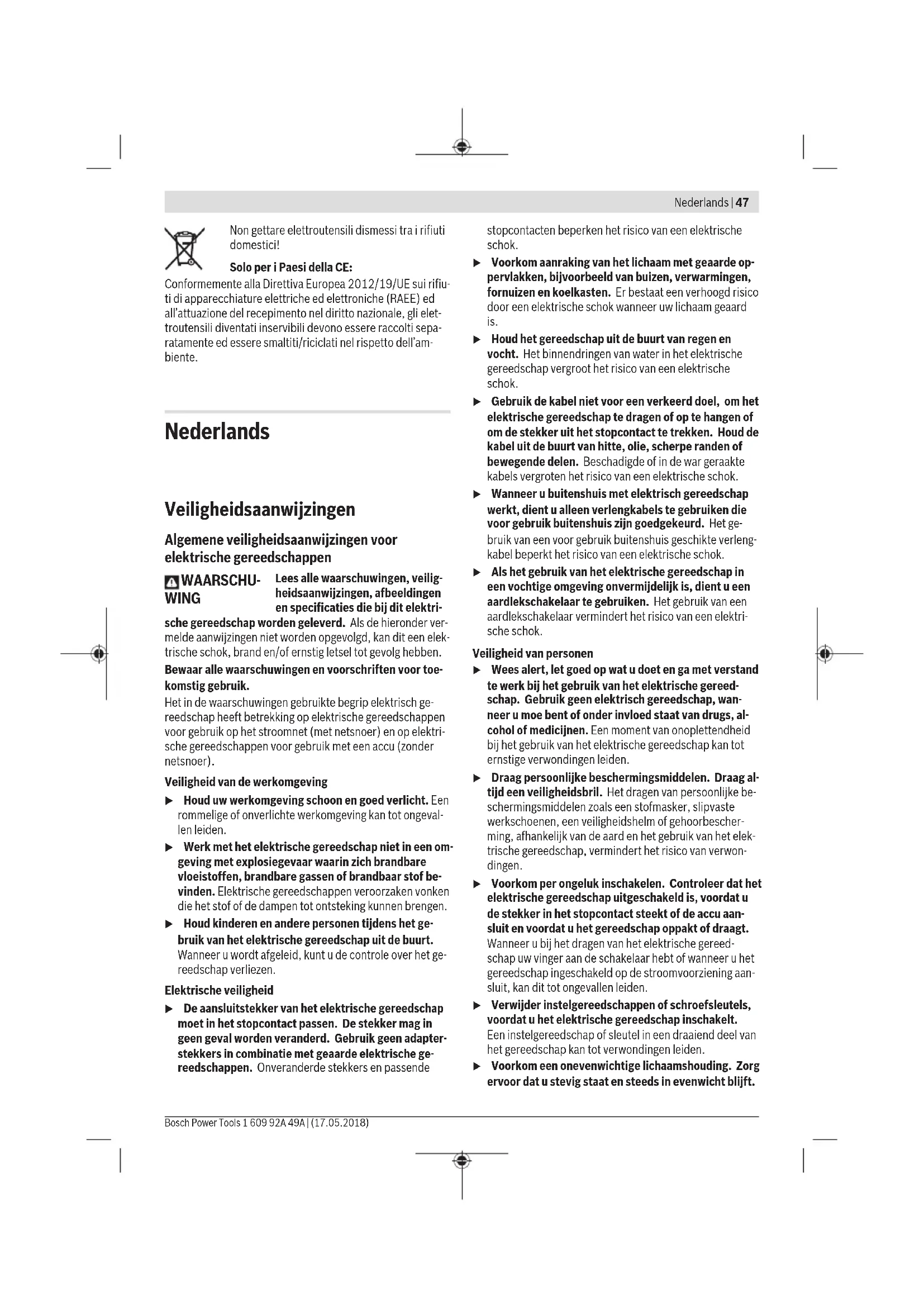 Schuurblad verwisselen (zie afbeelding A) Voor het verwijderen van het schuurblad (10) tilt u dit opzij op en trekt u het van het schuurplateau (8) af. Verwijder vóór het aanbrengen van een nieuw schuurblad vuil en stof van het schuurplateau (8), bijv. met een kwastje. Het oppervlak van het schuurplateau (8) bestaat uit klitweef- sel, zodat u schuurbladen met klithechting snel en eenvoudig kunt bevestigen. Duw het schuurblad (10) stevig op de onderkant van het schuurplateau (8). Let er voor het waarborgen van een optimale stofafzuiging op dat de perforaties in het schuurblad overeenstemmen met de openingen bij het schuurplateau. Keuze van het schuurplateau Afhankelijk van de toepassing kan het elektrische gereed- schap worden uitgerust met schuurplateaus van verschillen- de hardheid: – Schuurplateau extra zacht: geschikt voor polijsten en schuren met gevoel, ook op gebogen oppervlakken. – Schuurplateau zacht: geschikt voor alle schuurwerkzaam- heden, universeel toepasbaar. – Schuurplateau hard: geschikt voor grote schuurcapaciteit op egale oppervlakken. Schuurplateau wisselen (zie afbeelding B) Aanwijzing: Vervang een beschadigd (8) schuurplateau on- middellijk. Trek het schuurblad of polijstgereedschap los. Draai de schroef (11) volledig eruit en neem het schuurplateau (8) af. Plaats het nieuwe schuurplateau (8) en draai de schroef weer vast. Aanwijzing: Let er bij het plaatsen van het schuurplateau op dat de vertandingen van de meenemer in de uitsparingen van het schuurplateau vastgrijpen. Aanwijzing: Een beschadigde schuurplateaudrager mag al- leen worden vervangen door een erkend servicecentrum voor elektrisch gereedschap van Bosch. Afzuiging van stof en spanen Stof van materialen zoals loodhoudende verf, enkele hout- soorten, mineralen en metaal kan schadelijk voor de gezond- heid zijn. Aanraking of inademing van stof kan leiden tot al- lergische reacties en/of luchtwegaandoeningen bij de ge- bruiker of personen die zich in de omgeving bevinden. Bepaalde soorten stof, bijvoorbeeld van eiken- en beuken- hout, gelden als kankerverwekkend, in het bijzonder in com- binatie met additieven voor houtbehandeling (chromaat en houtbeschermingsmiddelen). Asbesthoudend materiaal mag alleen door gespecialiseerde vakmensen worden be- werkt. – Gebruik indien mogelijk een voor het materiaal geschikte stofafzuiging. – Zorg voor een goede ventilatie van de werkplek. – Er wordt geadviseerd om een stofmasker met filterklasse P2 te dragen. Neem de in uw land geldende voorschriften voor de te be- werken materialen in acht. u Vermijd ophoping van stof op de werkplek. Stof kan gemakkelijk ontbranden. Eigen afzuiging met stofbox (zie afbeeldingen C–G) Schuif de stofbox (7) op de uitblaasopening (12). Draai de- ze daarbij zodanig dat de uitsparingen van de stofbox tegen de punten van de uitblaasopening liggen en de stofbox merk- baar vastklikt. Het vulniveau van de stofbox (7) kan door het transparante reservoir gemakkelijk gecontroleerd worden. Voor het leegmaken van de stofbox (7) trekt u deze iets draaiend naar achter toe eraf. Schroef het filterelement (6) open en trek het uit de stofbox (7). Maak de stofbox leeg. Klop het filterelement (6) licht op een stevige ondergrond uit om het stof los te maken. Reinig de lamellen van het filterele- ment (6) met een zachte borstel. Aanwijzing: Om een optimale stofafzuiging te waarborgen, maakt u de stofbox (7) tijdig leeg en reinigt u het filterele- ment (6) regelmatig. Houd het elektrische gereedschap bij het werken op vertica- le vlakken zodanig dat de stofbox (7) naar beneden wijst. Externe afzuiging (zie afbeelding H) Steek een afzuigslang (13) op de uitblaasopening (12). Schuif (zoals afgebeeld) de afzuigslang zodanig op de uit- blaasopening dat de zijwaartse openingen van de uitblaas- opening vrij blijven. Daardoor wordt voorkomen dat het elek- trische gereedschap zich tijdens het schuren aan het werk- Nederlands | 51 Bosch Power Tools 1 609 92A 49A | (17.05.2018)52 | Nederlands 1 609 92A 49A | (17.05.2018) Bosch Power Tools stuk vastzuigt en de oppervlaktekwaliteit van het werkstuk nadelig wordt beïnvloed. Verbind de afzuigslang (13) met een stofzuiger (accessoire). Een overzicht voor aansluiting op verschillende stofzuigers vindt u aan het einde van deze gebruiksaanwijzing. De stofzuiger moet geschikt zijn voor het te bewerken mate- riaal. Gebruik bij het afzuigen van voor de gezondheid bijzonder gevaarlijk, kankerverwekkend of droog stof een speciale zui- ger. Houd bij werkzaamheden op verticale oppervlakken het elektrische gereedschap zo vast dat de afzuigslang omlaag wijst. Extra handgreep De extra handgreep (1) zorgt voor een comfortabele bedie- ning en optimale krachtverdeling, vooral bij een groot afna- mevermogen. Bevestig de extra handgreep (1) met de schroef (2) aan de behuizing. Gebruik Ingebruikname u Let op de netspanning! De spanning van de stroom- bron moet overeenkomen met de gegevens op het ty- peplaatje van het elektrische gereedschap. Met 230V aangeduide elektrische gereedschappen kunnen ook met 220V worden gebruikt. In- en uitschakelen u Zorg ervoor dat u de aan/uit-schakelaar kunt bedienen zonder de handgreep los te laten. Voor het inschakelen van het elektrische gereedschap drukt u op de aan/uit-schakelaar (4). Voor het vastzetten van de aan/uit-schakelaar (4) houdt u deze ingedrukt en drukt u bovendien op de vastzetknop (5). Voor het uitschakelen van het elektrische gereedschap laat u de aan/uit-schakelaar (4) los. Bij een vergrendelde aan/uit- schakelaar (4) drukt u deze eerst in en laat u deze daarna los. Aantal schuurbewegingen vooraf instellen Met het stelwiel voorselectie trilfrequentie (3) kunt u de be- nodigde trilfrequentie ook tijdens het bedrijf voorselecteren. 1 – 2 lage trilfrequentie 3 – 4 gemiddelde trilfrequentie 5 – 6 hoge trilfrequentie De benodigde trilfrequentie is afhankelijk van het materiaal en de werkomstandigheden en kan proefsgewijs worden vastgesteld. Laat na langdurige werkzaamheden met