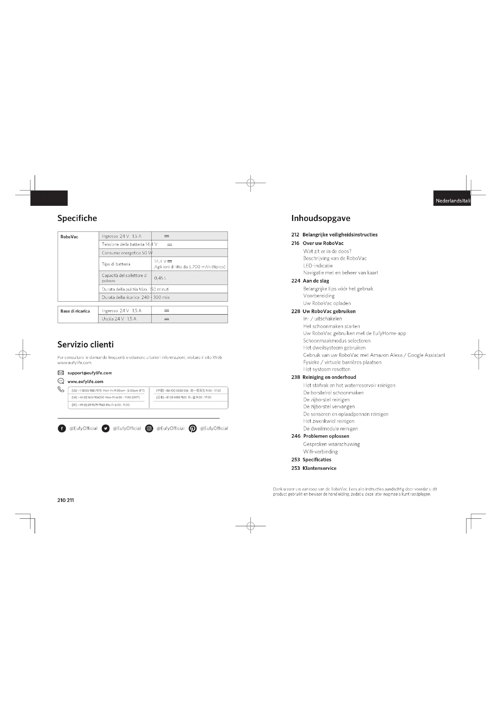 - Caricare RoboVac agganciandolo alla base di ricarica.210 211 NederlandsItaliano Specifiche RoboVac Ingresso 24 V 1,5 A Tensione della batteria 14,4 V Consumo energetico 50 W Tipo di batteria 14,4 V Agli ioni di litio da 5.200 mAh (tipico) Capacità del collettore di polvere 0,45 L Durata della pulizia Max. 150 minuti Durata della ricarica 240 - 300 min Base di ricarica Ingresso 24 V 1,5 A Uscita 24 V 1,5 A Servizio clienti Per consultare le domande frequenti e ottenere ulteriori informazioni, visitare il sito Web www.eufylife.com. support@eufylife.com www.eufylife.com Dank u voor uw aankoop van de RoboVac. Lees alle instructies aandachtig door voordat u dit product gebruikt en bewaar de handleiding, zodat u deze later nogmaals kunt raadplegen. Inhoudsopgave 212 Belangrijke veiligheidsinstructies 216 Over uw RoboVac Wat zit er in de doos? Beschrijving van de RoboVac LED-indicatie Navigatie met en beheer van kaart 224 Aan de slag Belangrijke tips vóór het gebruik Voorbereiding Uw RoboVac opladen 228 Uw RoboVac gebruiken In- / uitschakelen Het schoonmaken starten Uw RoboVac gebruiken met de EufyHome-app Schoonmaakmodus selecteren Het dweilsysteem gebruiken Gebruik van uw RoboVac met Amazon Alexa / Google Assistant Fysieke / virtuele barrières plaatsen Het systeem resetten 238 Reiniging en onderhoud Het stofvak en het waterreservoir reinigen De borstelrol schoonmaken De zijborstel reinigen De zijborstel vervangen De sensoren en oplaadpennen reinigen Het zwenkwiel reinigen De dweilmodule reinigen 246 Problemen oplossen Gesproken waarschuwing Wifi-verbinding 253 Specificaties 253 Klantenservice212 213 Nederlands Nederlands Belangrijke veiligheidsinstructies Om het risico van letsel of schade te verminderen, leest u deze veiligheidsinstructies aandachtig door en houdt u ze bij de hand tijdens het instellen, gebruiken en onderhouden van dit apparaat. GEBRUIKTE WAARSCHUWINGSSYMBOLEN Dit is het symbool voor een veiligheidswaarschuwing. Met dit symbool wordt u gewezen op mogelijke gevaren die kunnen leiden tot schade en/of ernstig lichamelijk letsel of de dood..