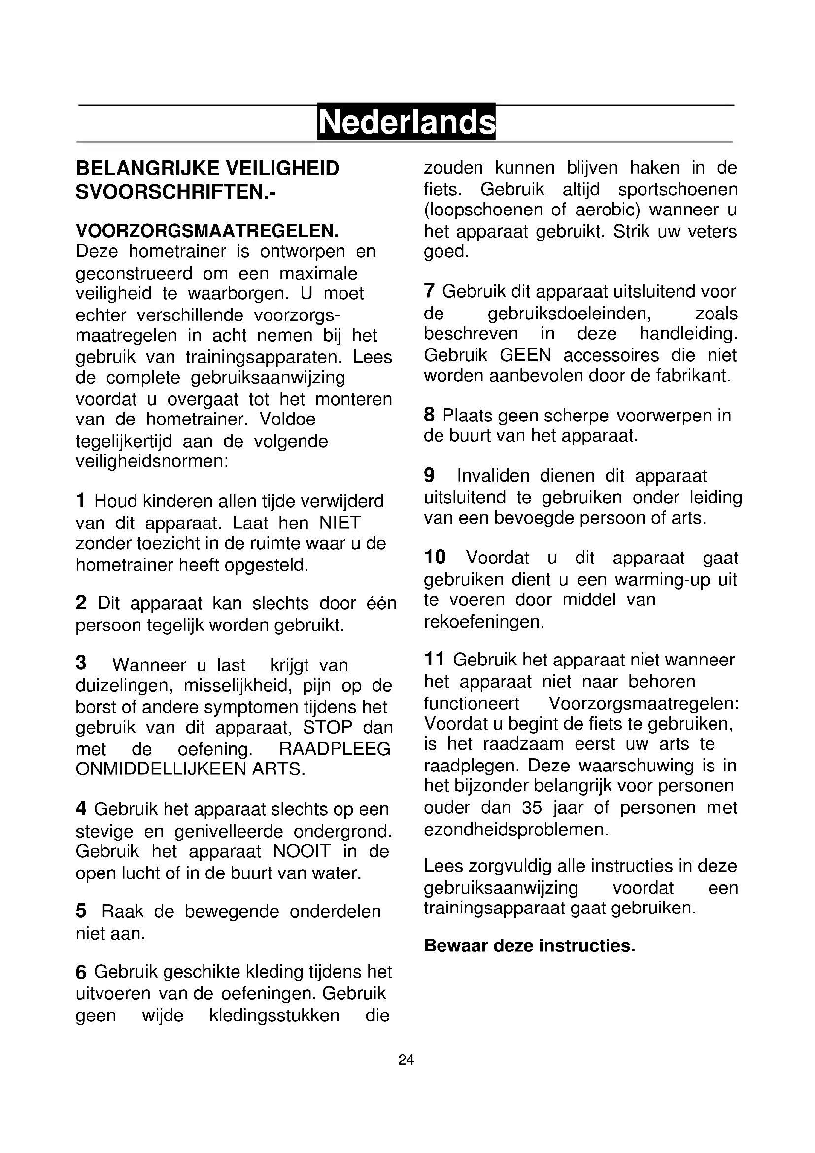 Gebruik het apparaat niet wanneer het apparaat niet naar behoren functioneert Voorzorgsmaatregelen: Voordat u begint de fiets te gebruiken, is het raadzaam eerst uw arts te raadplegen. Deze waarschuwing is in het bijzonder belangrijk voor personen ouder dan 35 jaar of personen met ezondheidsproblemen. Lees zorgvuldig alle instructies in deze gebruiksaanwijzing voordat een trainingsapparaat gaat gebruiken. Bewaar deze instructies.25