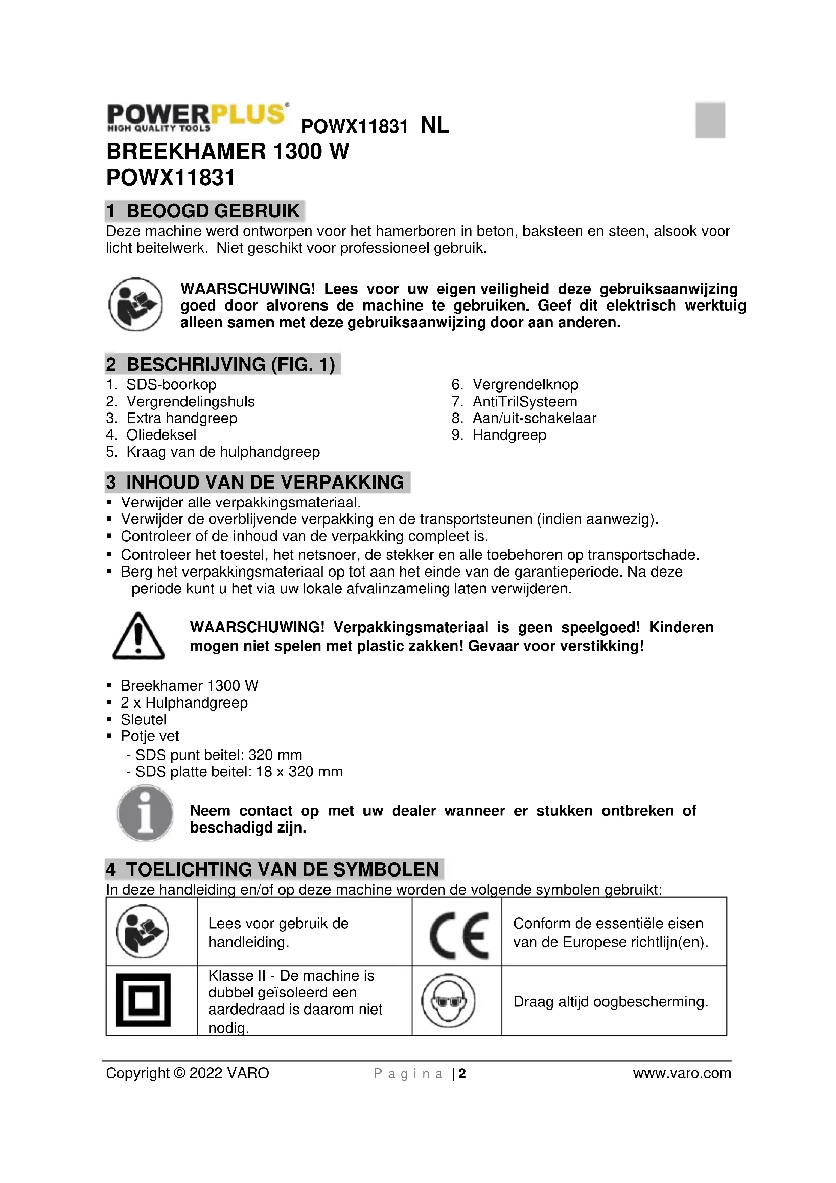 - Uw gereedschap moet als geheel naar uw dealer worden teruggebracht in een aanvaardbare staat van netheid, in zijn originele kunststof koffer (indien van toepassing op het product) en het moet vergezeld zijn van uw bewijs van aankoop.POWX11831 NL Copyright © 2022 VARO P a g i n a | 9 www.varo.com 15 MILIEU Wanneer uw machine na een lange gebruiksduur moet vervangen worden, werp ze dan niet bij het huishoudelijk afval maar doe dit op een milieuvriendelijke manier. Afval van elektrische machines mag niet op dezelfde manier behandeld worden als het gewone huishoudelijke afval. Breng het naar een plek waar het gerecycleerd kan worden. Raadpleeg de plaatselijke instanties of de verkoper voor adviezen over inzameling en verwerking. 16 CONFORMITEITSVERKLARING VARO N.V. - Vic. Van Rompuy N.V.- Joseph Van Instraat 9 - BE2500 Lier - BELGIUM, verklaart dat, Product: Breekhamer Handelsmerk: POWERplus Model: POWX11831 voldoet aan de essentiële eisen en aan de overige relevante bepalingen van de van toepassing zijnde Europese Richtlijnen, gebaseerd op de toepassing van Europese geharmoniseerde normen. Elke niet-toegelaten modificatie van het apparaat maakt deze verklaring nietig. Europese Richtlijnen (inclusief, indien van toepassing, hun wijzigingen tot op de datum van ondertekening): 2011/65/EU 2006/42/EC 2014/30/EU 2000/14/EC Annex VI LwA Measured 100dB(A) Guaranteed 105dB(A) Notified Body ISET – IT Europese geharmoniseerde normen (inclusief, indien van toepassing, hun wijzigingen tot op de datum van ondertekening): EN60745-1 : 2009 EN60745-2-6 : 2010 EN55014-1 : 2017 EN55014-2 : 2015