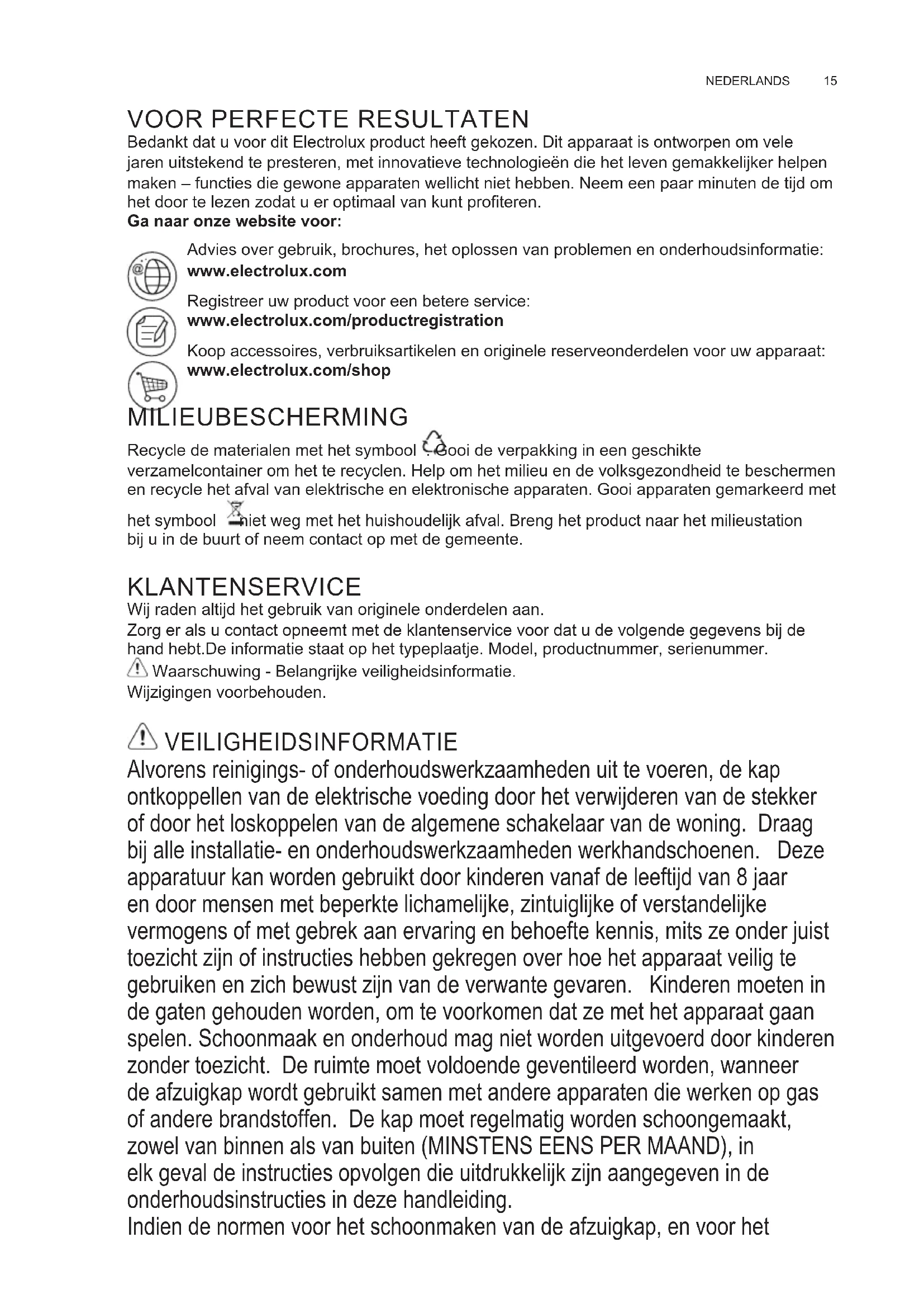 Bedankt dat u voor dit Electrolux product heeft gekozen Dit apparaat is ontworpen om vele jaren uitstekend te presteren, met innovatieve technologieën die het leven gemakkelijker helpen maken – functies die gewone apparaten wellicht niet hebben Neem een paar minuten de tijd om het door te lezen zodat u er optimaal van kunt proteren. Ga naar onze website voor: Advies over gebruik, brochures, het oplossen van problemen en onderhoudsinformatie: www.electrolux.com Registreer uw product voor een betere service: www.electrolux.com/productregistration Koop accessoires, verbruiksartikelen en originele reserveonderdelen voor uw apparaat: www.electrolux.com/shop MILIEUBESCHERMING Recycle de materialen met het symbool Gooi de verpakking in een geschikte verzamelcontainer om het te recyclen Help om het milieu en de volksgezondheid te beschermen en recycle het afval van elektrische en elektronische apparaten Gooi apparaten gemarkeerd met het symbool niet weg met het huishoudelijk afval Breng het product naar het milieustation bij u in de buurt of neem contact op met de gemeente KLANTENSERVICE Wij raden altijd het gebruik van originele onderdelen aan Zorg er als u contact opneemt met de klantenservice voor dat u de volgende gegevens bij de hand hebtDe informatie staat op het typeplaatje Model, productnummer, serienummer Waarschuwing - Belangrijke veiligheidsinformatie Wijzigingen voorbehouden VEILIGHEIDSINFORMATIE Alvorens reinigings- of onderhoudswerkzaamheden uit te voeren, de kap ontkoppellen van de elektrische voeding door het verwijderen van de stekker of door het loskoppelen van de algemene schakelaar van de woning. Draag bij alle installatie- en onderhoudswerkzaamheden werkhandschoenen. Deze apparatuur kan worden gebruikt door kinderen vanaf de leeftijd van 8 jaar en door mensen met beperkte lichamelijke, zintuiglijke of verstandelijke vermogens of met gebrek aan ervaring en behoefte kennis, mits ze onder juist toezicht zijn of instructies hebben gekregen over hoe het apparaat veilig te gebruiken en zich bewust zijn van de verwante gevaren. Kinderen moeten in de gaten gehouden worden, om te voorkomen dat ze met het apparaat gaan spelen. Schoonmaak en onderhoud mag niet worden uitgevoerd door kinderen zonder toezicht. De ruimte moet voldoende geventileerd worden, wanneer de afzuigkap wordt gebruikt samen met andere apparaten die werken op gas of andere brandstoffen. De kap moet regelmatig worden schoongemaakt, zowel van binnen als van buiten (MINSTENS EENS PER MAAND), in elk geval de instructies opvolgen die uitdrukkelijk zijn aangegeven in de onderhoudsinstructies in deze handleiding. Indien de normen voor het schoonmaken van de afzuigkap, en voor het NL GEBRUIKSAANWIJZINGwww.electrolux.com16 vervangen en schoonmaken van de lters niet worden nageleefd, kan dat brandgevaar opleveren. Het is ten strengste verboden voedsel direct boven de vlam te bereiden onder de kap. Het gebruik van open vlammen is schadelijk voor de lters en kan brand veroorzaken, dus moet in ieder geval worden vermeden. Het frituren moet constant in de gaten gehouden worden om te voorkomen dat oververhitte olie brand vat. Waarschuwing! Wanneer de kookplaat in gebruik is, kunnen de toegankelijke delen van de afzuigkap heet worden.adapters toegestaan en geen verdeelstekkers of stekkerdozen. Voor vervanging van de lamp alleen het type lamp gebruiken dat aangegeven is in het deel ‘onderhoud / vervangen van de lamp’ in deze handleiding. Waarschuwing! Het apparaat niet aansluiten op het elektriciteitsnet voordat de installatie volledig is voltooid. Voor de aansluiting van de afzuigkap op het elektriciteitsnet zijn alleen goedgekeurde.