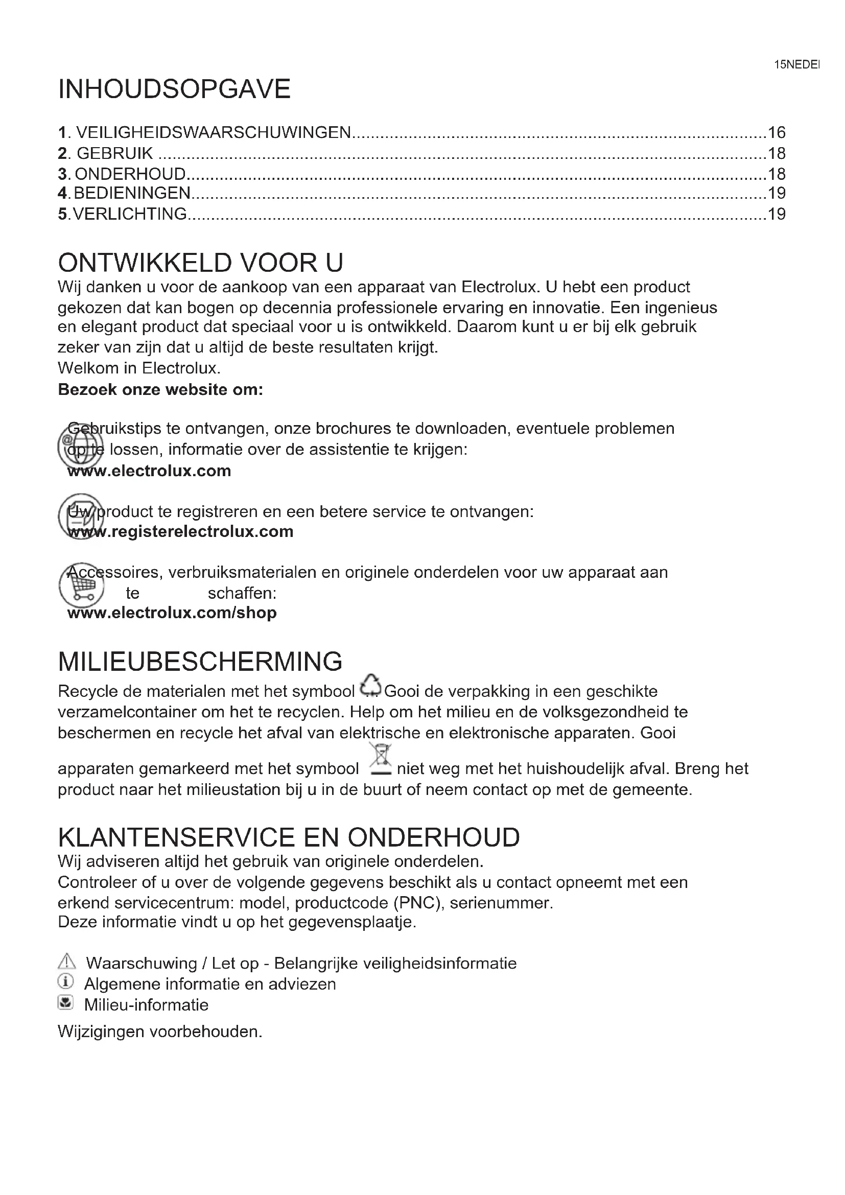 Wij adviseren altijd het gebruik van originele onderdelen. Controleer of u over de volgende gegevens beschikt als u contact opneemt met een erkend servicecentrum: model, productcode (PNC), serienummer. Deze informatie vindt u op het gegevensplaatje. Waarschuwing / Let op - Belangrijke veiligheidsinformatie Algemene informatie en adviezen Milieu-informatie Wijzigingen voorbehouden.16 www.electrolux.com