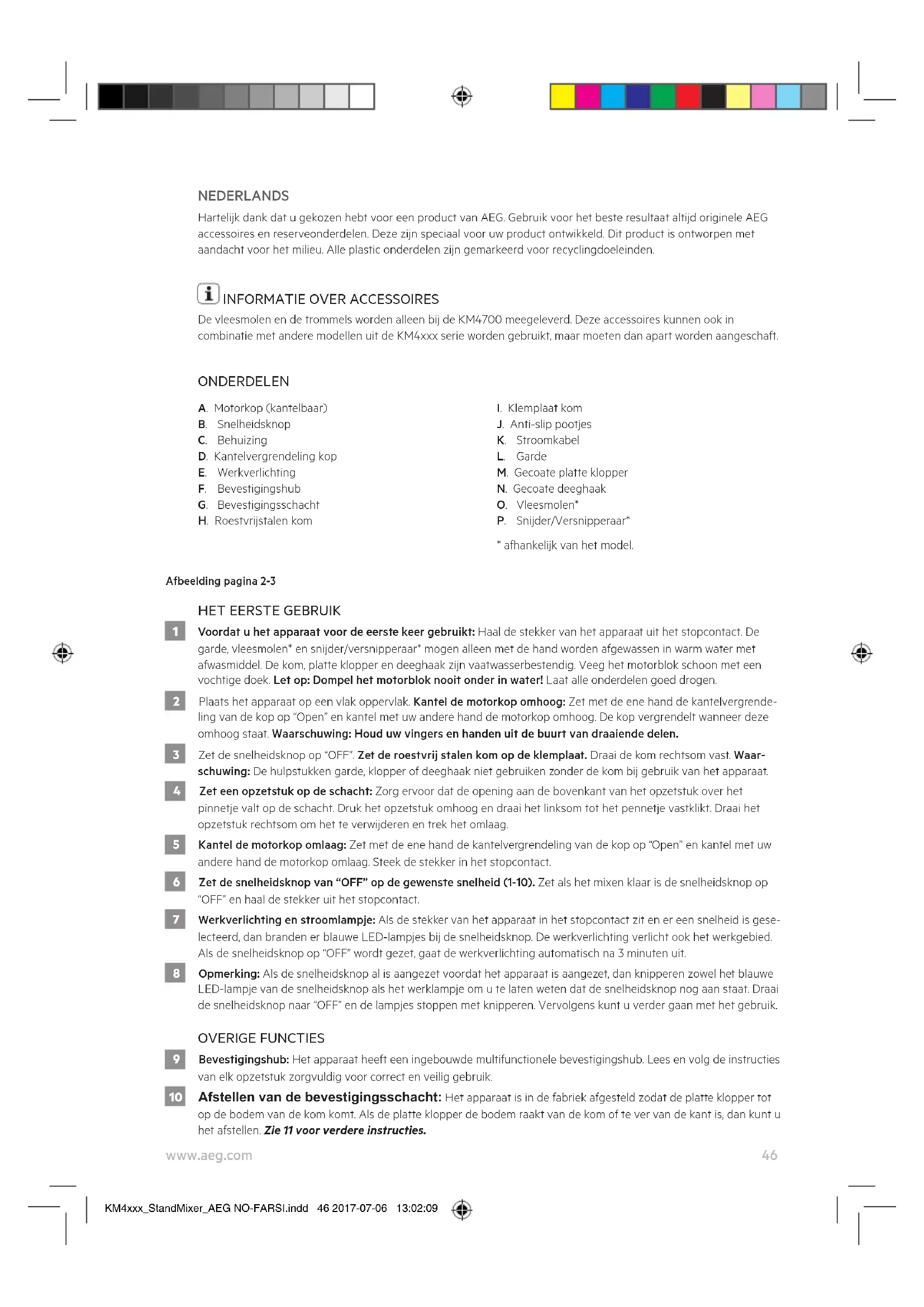 18 Haal de stekker van het apparaat uit het stopcontact. De garde, vleesmolen* en snijder/versnipperaar* mogen alleen met de hand worden afgewassen in warm water met afwasmiddel. De kom, platte klopper en deeghaak zijn vaatwasserbestendig. Veeg het motorblok schoon met een vochtige doek. Let op: Dompel het motorblok nooit onder in water! Laat alle onderdelen goed drogen. 19 Gebruik geen agressieve reinigingsmiddelen of schuursponsjes om het apparaat schoon te maken. Veel plezier met uw nieuwe AEG-product! KM4xxx_StandMixer_AEG NO-FARSI.indd 47 2017-07-06 13:02:1048 www.aeg.com VEILIGHEIDSADVIES Lees de volgende instructies zorgvuldig door voordat u het apparaat voor het eerst gebruikt.