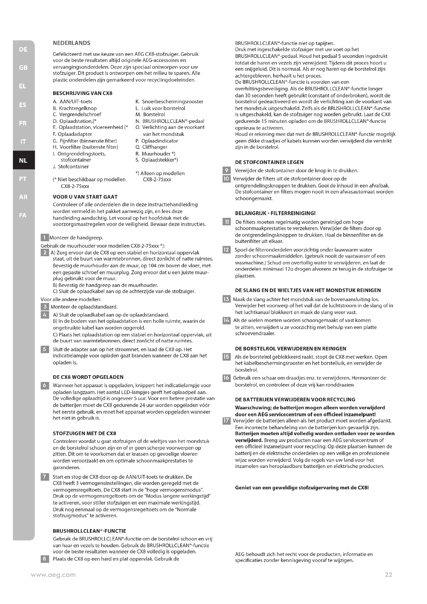 Waarschuwing; de batterijen mogen alleen worden verwijderd door een AEG servicecentrum of een ocieel inzamelpunt! 17 Verwijder de batterijen alleen als het product moet worden afgedankt. Een incorrecte behandeling van de batterijen kan gevaarlijk zijn. Batterijen moeten altijd volledig worden ontladen voor ze worden verwijderd. Breng uw producten naar een AEG servicecentrum of een ocieel inzamelpunt voor recycling. Op deze plaatsen kunnen de batterij en de elektrische onderdelen op een veilige en professionele wijze worden verwijderd. Volg de regels van uw land voor het inzamelen van heroplaadbare batterijen en elektrische producten. Geniet van een geweldige stofzuigervaring met de CX8! 22www.aeg.com