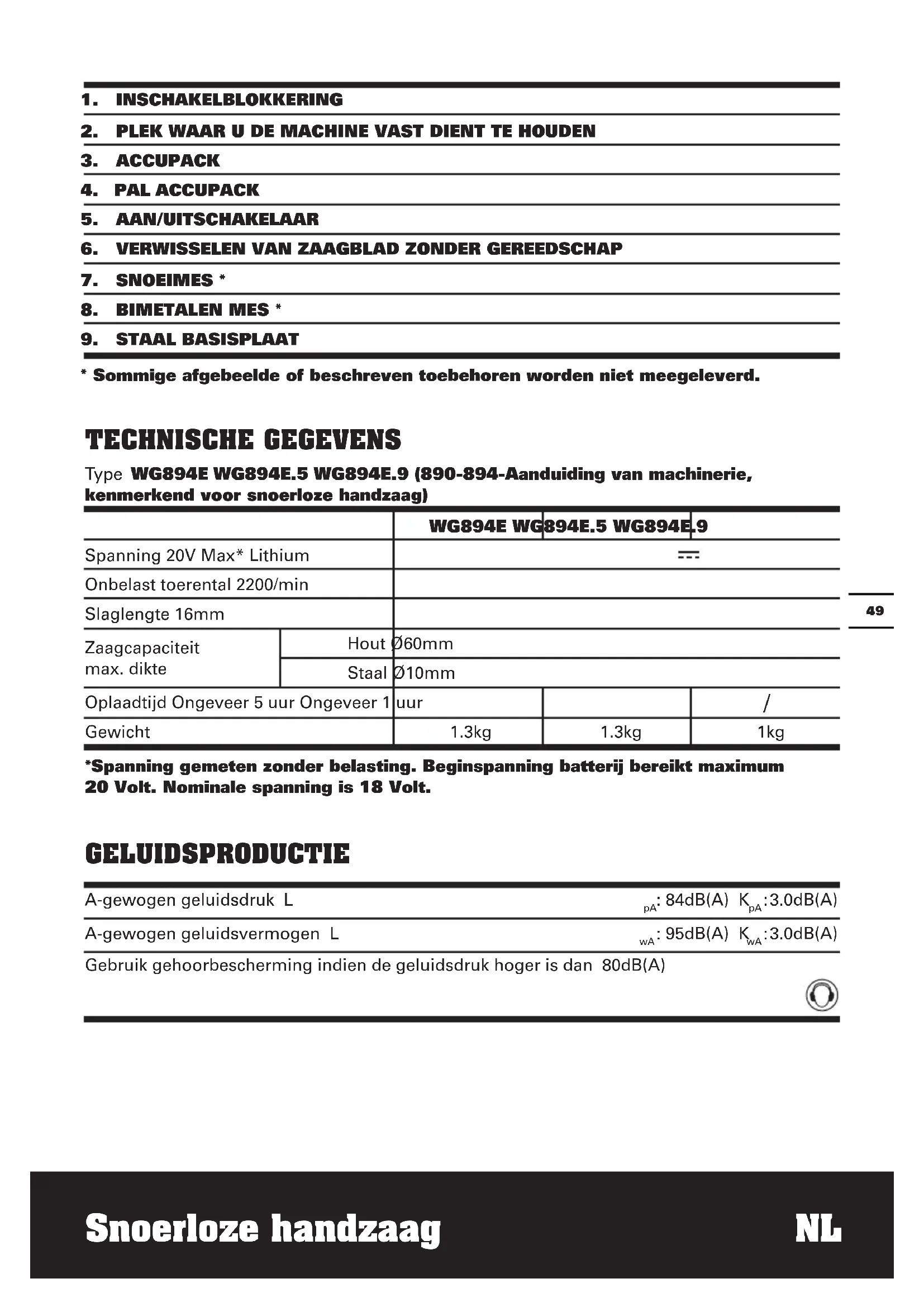 3.0dB(A) Gebruik gehoorbescherming indien de geluidsdruk hoger is dan 80dB(A) TECHNISCHE GEGEVENS Type WG894E WG894E.5 WG894E.9 (890-894-Aanduiding van machinerie, kenmerkend voor snoerloze handzaag) WG894E WG894E.5 WG894E.9 Spanning 20V Max* Lithium Onbelast toerental 2200/min Slaglengte 16mm Zaagcapaciteit max. dikte Hout Ø60mm Staal Ø10mm Oplaadtijd Ongeveer 5 uur Ongeveer 1 uur
