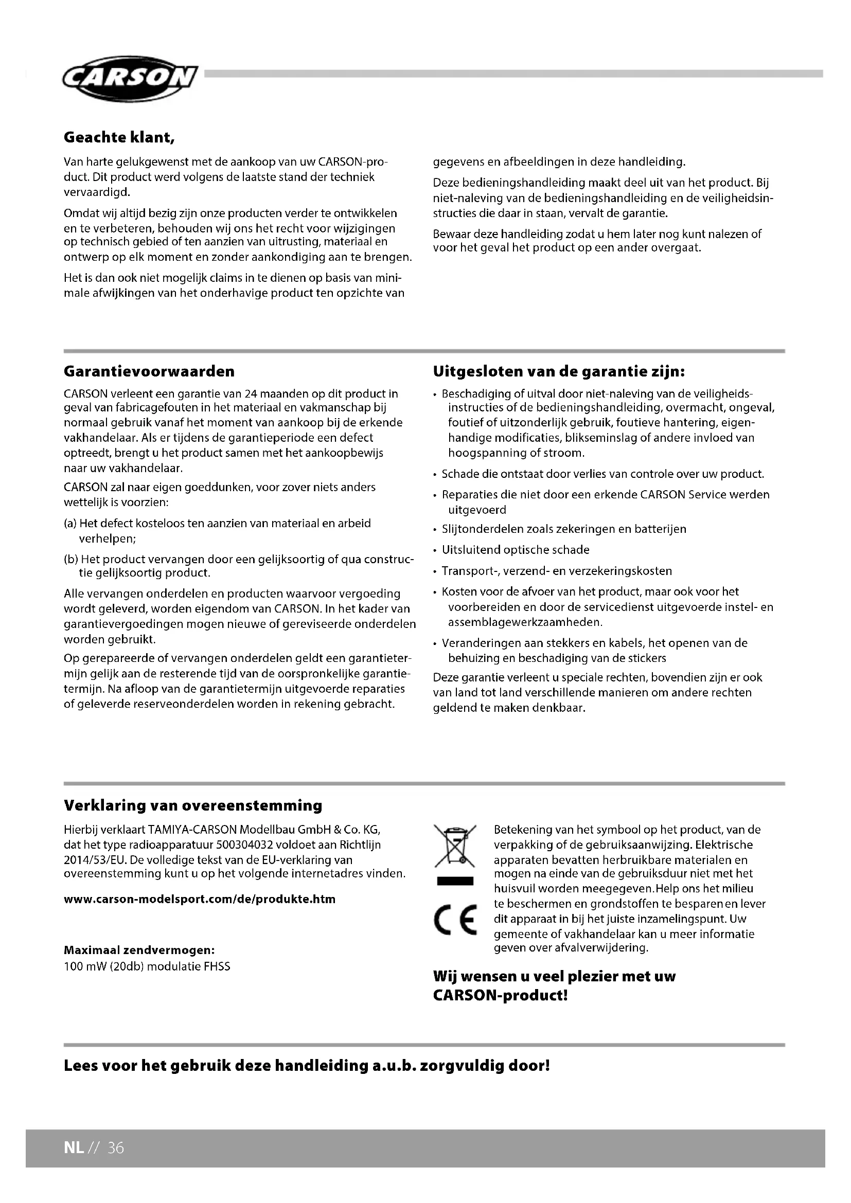 - Veranderingen aan stekkers en kabels, het openen van de behuizing en beschadiging van de stickers Deze garantie verleent u speciale rechten, bovendien zijn er ook van land tot land verschillende manieren om andere rechten geldend te maken denkbaar. Lees voor het gebruik deze handleiding a.u.b. zorgvuldig door! Hierbij verklaart TAMIYA-CARSON Modellbau GmbH & Co. KG, dat het type radioapparatuur 500304032 voldoet aan Richtlijn 2014/53/EU. De volledige tekst van de EU-verklaring van overeenstemming kunt u op het volgende internetadres vinden. www.carson-modelsport.com/de/produkte.htm Maximaal zendvermogen: 100 mW (20db) modulatie FHSS Betekening van het symbool op het product, van de verpakking of de gebruiksaanwijzing. Elektrische apparaten bevatten herbruikbare materialen en mogen na einde van de gebruiksduur niet met het huisvuil worden meegegeven. Help ons het milieu te beschermen en grondstoffen te besparen en lever dit apparaat in bij het juiste inzamelingspunt. Uw gemeente of vakhandelaar kan u meer informatie geven over afvalverwijdering. Wij wensen u veel plezier met uw CARSON-product! Verklaring van overeenstemming37 // NL 1.Algemeen Nikkel-metaalhydride (NiMH) accu's zijn energieopslagmedia met een zeer hoge energiedichtheid die gevaar kunnen opleveren.Dit is de reden waarom u er heel voorzichtig mee moet omgaan bij het laden, ontladen, opslaan en het hanteren. Lees deze handleiding heel zorgvuldig voordat u de accu voor de eerste keer gebruikt.Volg altijd beslist de vermelde waarschuwingen en gebruiksaanwijzingen op. Onjuiste behandeling kan leiden tot risico's zoals explosies, oververhitting of brand. Niet opvolgen van de instructies voor het gebruik leidt tot voortijdige slijtage of andere defecten. Deze handleiding dient veilig opgeborgen te worden en in geval van doorgeven van de accu beslist meegegeven aan de volgende eigenaar. 2.Waarschuwingen