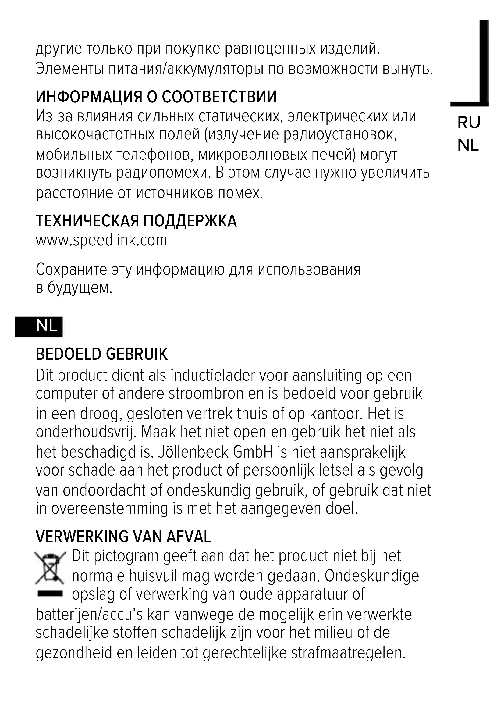 Velden met een sterke statische, elektrische of hoogfrequente lading (radioapparatuur, draadloze telefoons, ontladingen van microgolven) kunnen van invloed zijn op de werking van het apparaat (de apparaten). Probeer in dat geval de afstand tot de storende apparaten te vergroten. TECHNISCHE ONDERSTEUNING www.speedlink.com Bewaar deze informatie voor toekomstige naslag.
