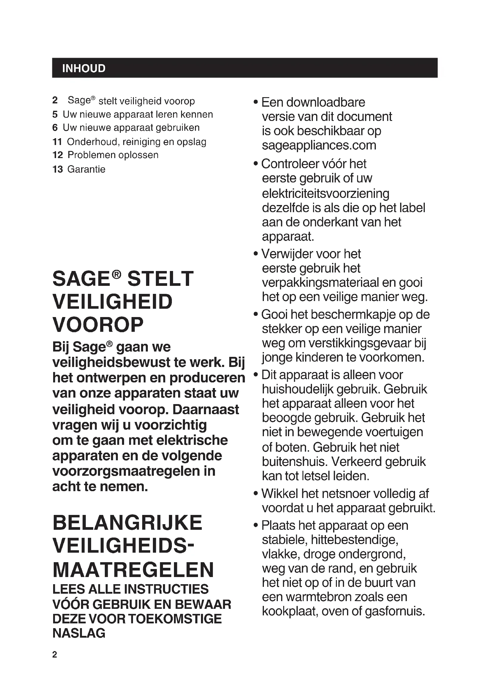 - Een downloadbare versie van dit document is ook beschikbaar op sageappliances.com