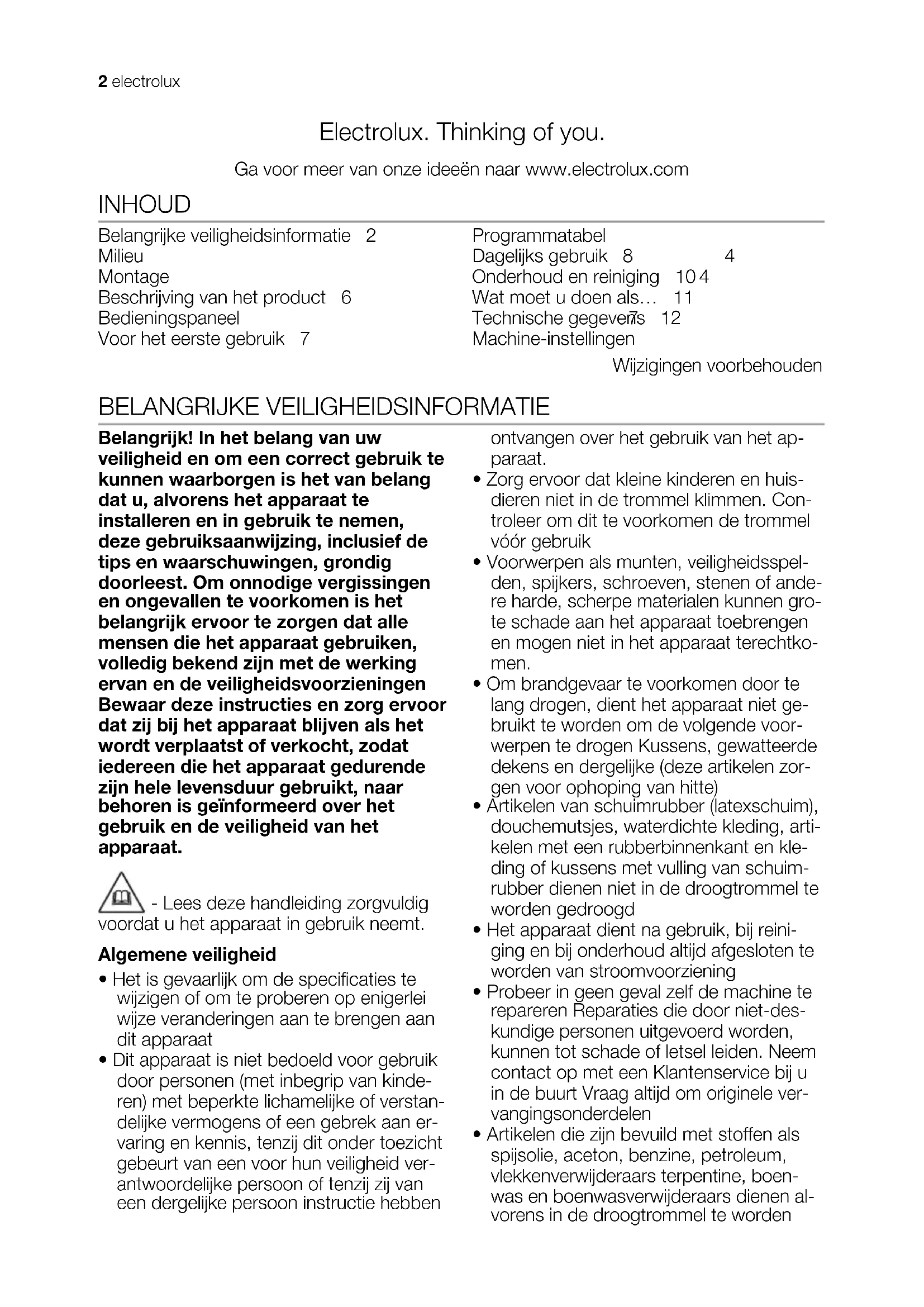 gebruiksaanwijzing notice d'utilisation benutzerinformation user manual Wasdroger Sèche-linge Wäschetrockner Tumble dryer EDH 97941 WElectrolux. Thinking of you. Ga voor meer van onze ideeën naar www.electrolux.com INHOUD Belangrijke veiligheidsinformatie 2 Milieu 4 Montage 4 Beschrijving van het product 6 Bedieningspaneel 7 Voor het eerste gebruik 7 Programmatabel 7 Dagelijks gebruik 8 Onderhoud en reiniging 10 Wat moet u doen als… 11 Technische gegevens 12 Machine-instellingen 13 Wijzigingen voorbehouden BELANGRIJKE VEILIGHEIDSINFORMATIE Belangrijk! In het belang van uw veiligheid en om een correct gebruik te kunnen waarborgen is het van belang dat u, alvorens het apparaat te installeren en in gebruik te nemen, deze gebruiksaanwijzing, inclusief de tips en waarschuwingen, grondig doorleest. Om onnodige vergissingen en ongevallen te voorkomen is het belangrijk ervoor te zorgen dat alle mensen die het apparaat gebruiken, volledig bekend zijn met de werking ervan en de veiligheidsvoorzieningen Bewaar deze instructies en zorg ervoor dat zij bij het apparaat blijven als het wordt verplaatst of verkocht, zodat iedereen die het apparaat gedurende zijn hele levensduur gebruikt, naar behoren is geïnformeerd over het gebruik en de veiligheid van het apparaat. - Lees deze handleiding zorgvuldig voordat u het apparaat in gebruik neemt. Algemene veiligheid