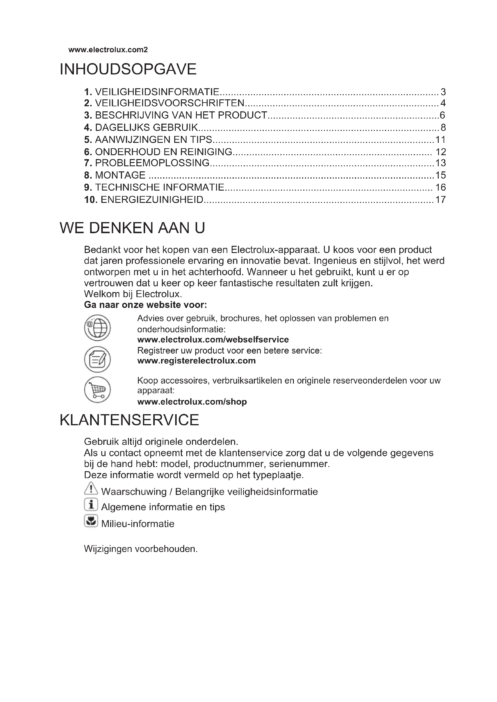 Bedankt voor het kopen van een Electrolux-apparaat. U koos voor een product dat jaren professionele ervaring en innovatie bevat. Ingenieus en stijlvol, het werd ontworpen met u in het achterhoofd. Wanneer u het gebruikt, kunt u er op vertrouwen dat u keer op keer fantastische resultaten zult krijgen. Welkom bij Electrolux. Ga naar onze website voor: Advies over gebruik, brochures, het oplossen van problemen en onderhoudsinformatie: www.electrolux.com/webselfservice Registreer uw product voor een betere service: www.registerelectrolux.com Koop accessoires, verbruiksartikelen en originele reserveonderdelen voor uw apparaat: www.electrolux.com/shop KLANTENSERVICE Gebruik altijd originele onderdelen. Als u contact opneemt met de klantenservice zorg dat u de volgende gegevens bij de hand hebt: model, productnummer, serienummer. Deze informatie wordt vermeld op het typeplaatje. Waarschuwing / Belangrijke veiligheidsinformatie Algemene informatie en tips Milieu-informatie Wijzigingen voorbehouden. www.electrolux.com21. VEILIGHEIDSINFORMATIE Lees zorgvuldig de meegeleverde instructies voor installatie en gebruik van het apparaat. De fabrikant is niet verantwoordelijk voor letsel en schade veroorzaakt door een foutieve installatie. Bewaar de instructies van het apparaat voor toekomstig gebruik.