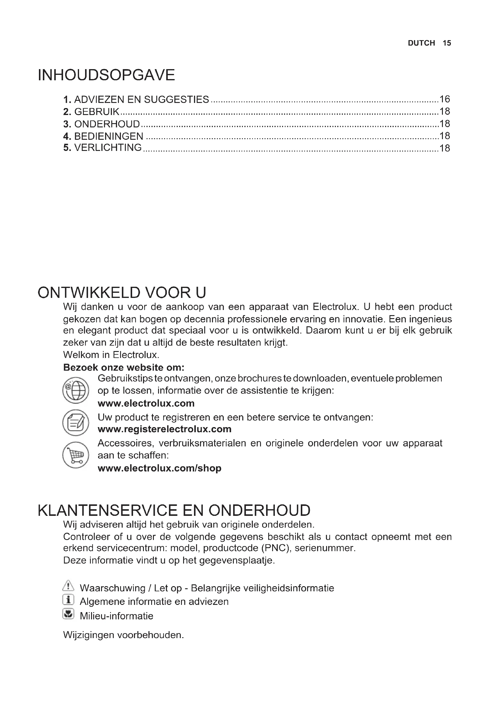 Wij adviseren altijd het gebruik van originele onderdelen. Controleer of u over de volgende gegevens beschikt als u contact opneemt met een erkend servicecentrum: model, productcode (PNC), serienummer. Deze informatie vindt u op het gegevensplaatje. Waarschuwing / Let op - Belangrijke veiligheidsinformatie Algemene informatie en adviezen Milieu-informatie Wijzigingen voorbehouden.16 www.electrolux.com
