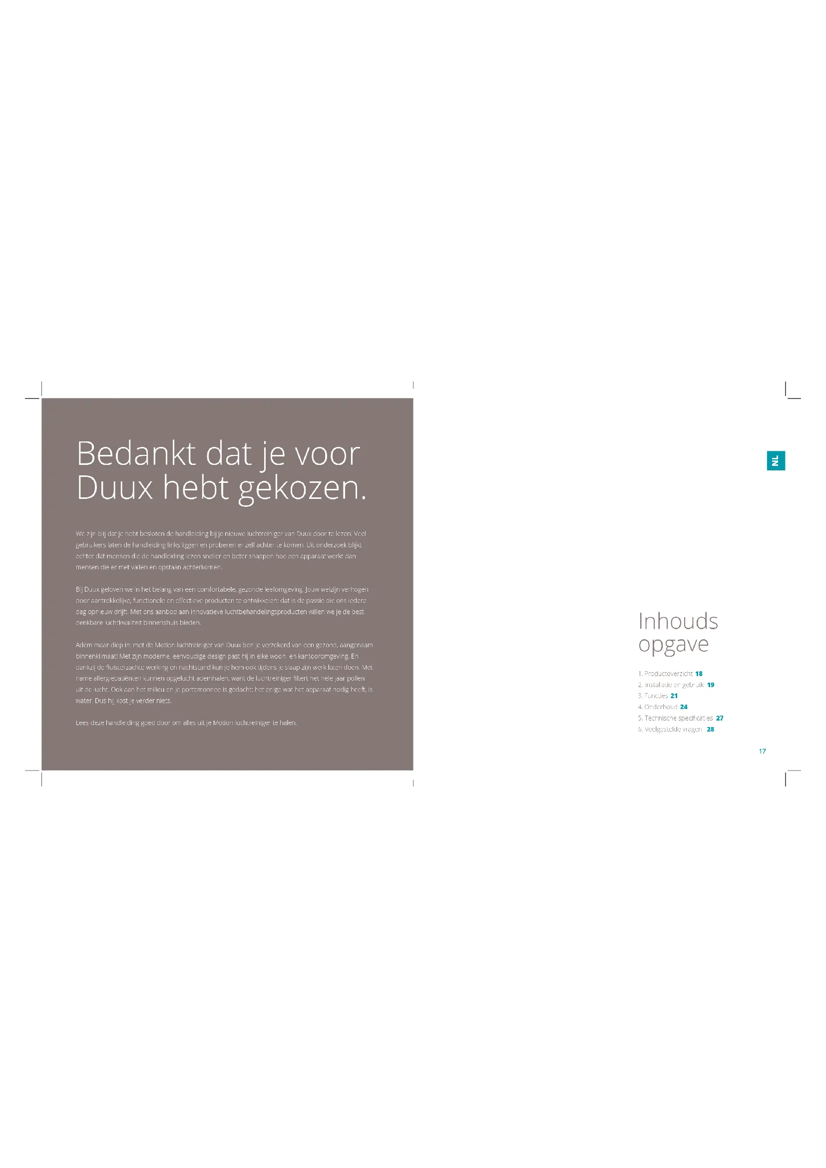 A.1716 Bedankt dat je voor Duux hebt gekozen. We zijn blij dat je hebt besloten de handleiding bij je nieuwe luchtreiniger van Duux door te lezen! Veel gebruikers laten de handleiding links liggen en proberen er zelf achter te komen. Uit onderzoek blijkt echter dat mensen die de handleiding lezen sneller en beter snappen hoe een apparaat werkt dan mensen die er met vallen en opstaan achterkomen. Bij Duux geloven we in het belang van een comfortabele, gezonde leefomgeving. Jouw welzijn verhogen door aantrekkelijke, functionele en eectieve producten te ontwikkelen: dat is de passie die ons iedere dag opnieuw drijft. Met ons aanbod aan innovatieve luchtbehandelingsproducten willen we je de best denkbare luchtkwaliteit binnenshuis bieden. Adem maar diep in: met de Motion luchtreiniger van Duux ben je verzekerd van een gezond, aangenaam binnenklimaat! Met zijn moderne, eenvoudige design past hij in elke woon- en kantooromgeving. En dankzij de uisterzachte werking en nachtstand kun je hem ook tijdens je slaap zijn werk laten doen. Met name allergiepatiënten kunnen opgelucht ademhalen, want de luchtreiniger ltert het hele jaar pollen uit de lucht. Ook aan het milieu en je portemonnee is gedacht: het enige wat het apparaat nodig heeft, is water. Dus hij kost je verder niets. Lees deze handleiding goed door om alles uit je Motion luchtreiniger te halen.
