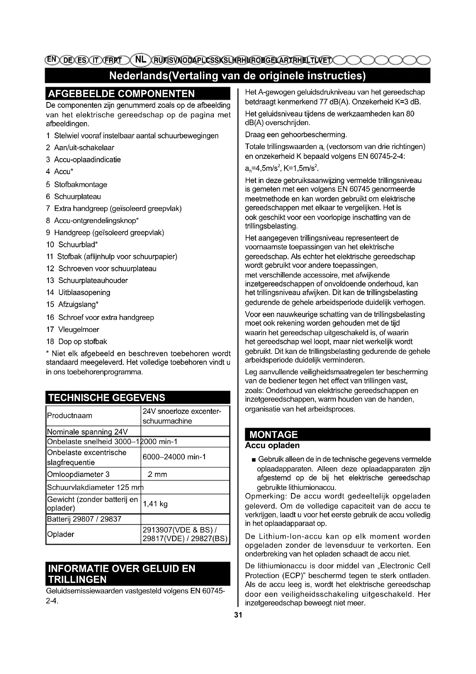 - Niet elk afgebeeld en beschreven toebehoren wordt standaard meegeleverd. Het volledige toebehoren vindt u in ons toebehorenprogramma. TECHNISCHE GEGEVENS Productnaam 24V snoerloze excenter- schuurmachine Nominale spanning 24V Onbelaste snelheid 3000–12000 min-1 Onbelaste excentrische slagfrequentie 6000–24000 min-1 Omloopdiameter 3