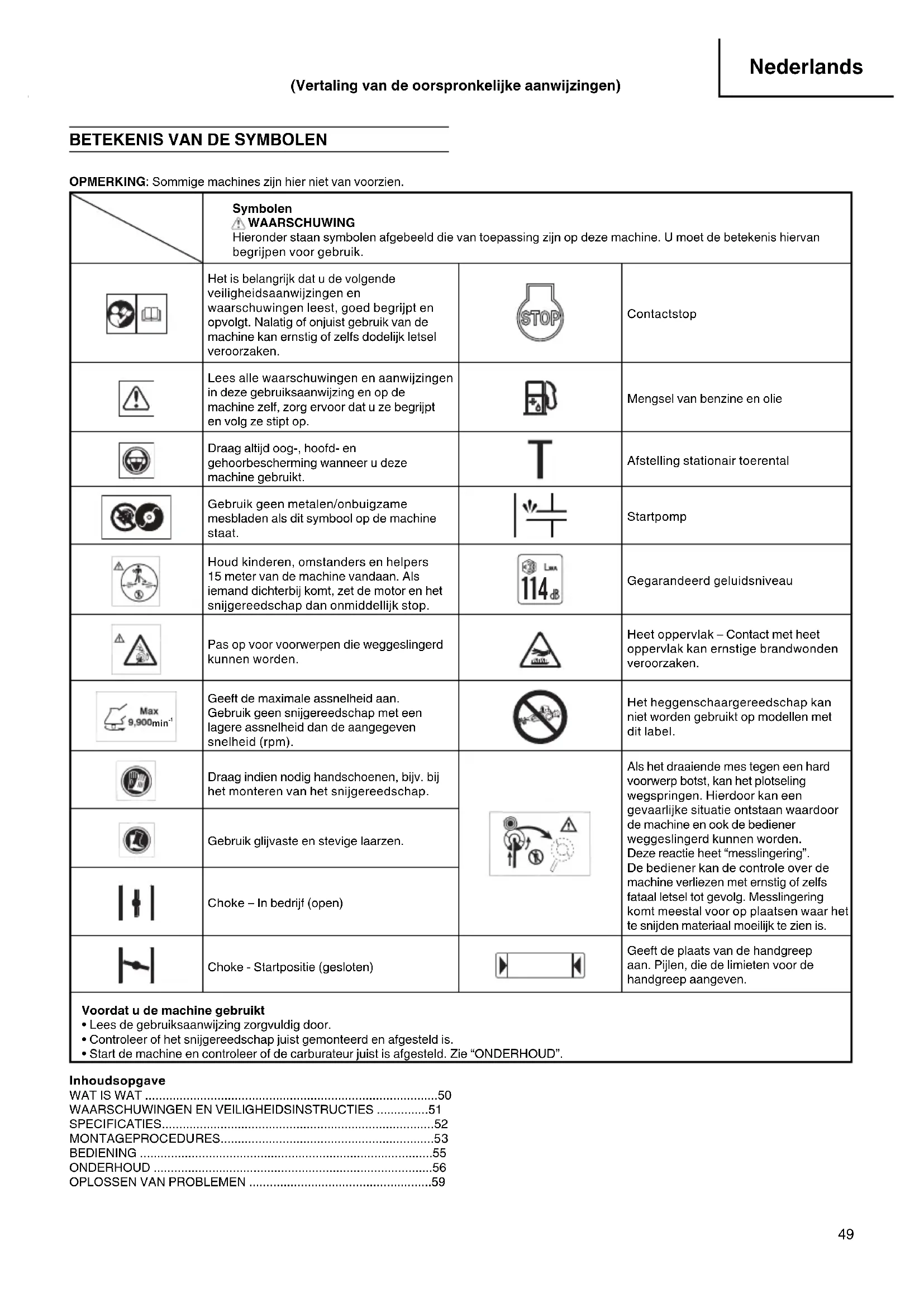 OPMERKING: Sommige machines zijn hier niet van voorzien. Symbolen WAARSCHUWING Hieronder staan symbolen afgebeeld die van toepassing zijn op deze machine. U moet de betekenis hiervan begrijpen voor gebruik. Het is belangrijk dat u de volgende veiligheidsaanwijzingen en waarschuwingen leest, goed begrijpt en opvolgt. Nalatig of onjuist gebruik van de machine kan ernstig of zelfs dodelijk letsel veroorzaken. Contactstop Lees alle waarschuwingen en aanwijzingen in deze gebruiksaanwijzing en op de machine zelf, zorg ervoor dat u ze begrijpt en volg ze stipt op. Mengsel van benzine en olie Draag altijd oog-, hoofd- en gehoorbescherming wanneer u deze machine gebruikt. Afstelling stationair toerental Gebruik geen metalen/onbuigzame mesbladen als dit symbool op de machine staat. Startpomp Houd kinderen, omstanders en helpers 15 meter van de machine vandaan. Als iemand dichterbij komt, zet de motor en het snijgereedschap dan onmiddellijk stop.
