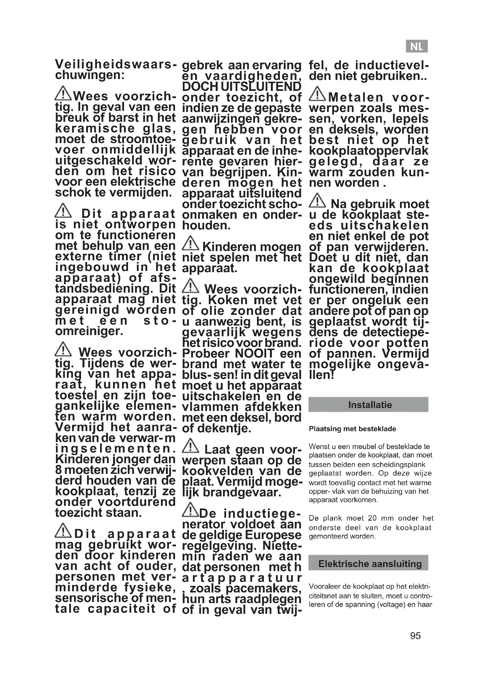 Veiligheidswaars- chuwingen: Wees voorzich- tig. In geval van een breuk of barst in het keramische glas, moet de stroomtoe- voer onmiddellijk uitgeschakeld wor- den om het risico voor een elektrische schok te vermijden. Dit apparaat is niet ontworpen om te functioneren met behulp van een externe timer (niet ingebouwd in het apparaat) of afs- tandsbediening. Dit apparaat mag niet gereinigd worden met een sto- omreiniger. Wees voorzich- tig. Tijdens de wer- king van het appa- raat, kunnen het toestel en zijn toe- gankelijke elemen- ten warm worden. Vermijd het aanra- ken van de verwar- m i n g s e l e m e n t e n . Kinderen jonger dan 8 moeten zich verwij- derd houden van de kookplaat, tenzij ze onder voortdurend toezicht staan. Dit apparaat mag gebruikt wor- den door kinderen van acht of ouder, personen met ver- minderde fysieke, sensorische of men- tale capaciteit of gebrek aan ervaring en vaardigheden, DOCH UITSLUITEND onder toezicht, of indien ze de gepaste aanwijzingen gekre- gen hebben voor gebruik van het apparaat en de inhe- rente gevaren hier- van begrijpen. Kin- deren mogen het apparaat uitsluitend onder toezicht scho- onmaken en onder- houden. Kinderen mogen niet spelen met het apparaat. Wees voorzich- tig. Koken met vet of olie zonder dat u aanwezig bent, is gevaarlijk wegens het risico voor brand. Probeer NOOIT een brand met water te blus- sen! in dit geval moet u het apparaat uitschakelen en de vlammen afdekken met een deksel, bord of dekentje. Laat geen voor- werpen staan op de kookvelden van de plaat. Vermijd moge- lijk brandgevaar. De inductiege- nerator voldoet aan de geldige Europese regelgeving. Niette- min raden we aan dat personen met h a r t a p p a r a t u u r , zoals pacemakers, hun arts raadplegen of in geval van twij- fel, de inductievel- den niet gebruiken.. Metalen voor- werpen zoals mes- sen, vorken, lepels en deksels, worden best niet op het kookplaatoppervlak gelegd, daar ze warm zouden kun- nen worden . Na gebruik moet u de kookplaat ste- eds uitschakelen en niet enkel de pot of pan verwijderen. Doet u dit niet, dan kan de kookplaat ongewild beginnen functioneren, indien er per ongeluk een andere pot of pan op geplaatst wordt tij- dens de detectiepe- riode voor potten of pannen. Vermijd mogelijke ongeva- llen! Installatie Plaatsing met besteklade Wenst u een meubel of besteklade te plaatsen onder de kookplaat, dan moet tussen beiden een scheidingsplank geplaatst worden. Op deze wijze wordt toevallig contact met het warme opper- vlak van de behuizing van het apparaat voorkomen. De plank moet 20 mm onder het onderste deel van de kookplaat gemonteerd worden. Elektrische aansluiting Vooraleer de kookplaat op het elektri- citeitsnet aan te sluiten, moet u contro- leren of de spanning (voltage) en haarNL