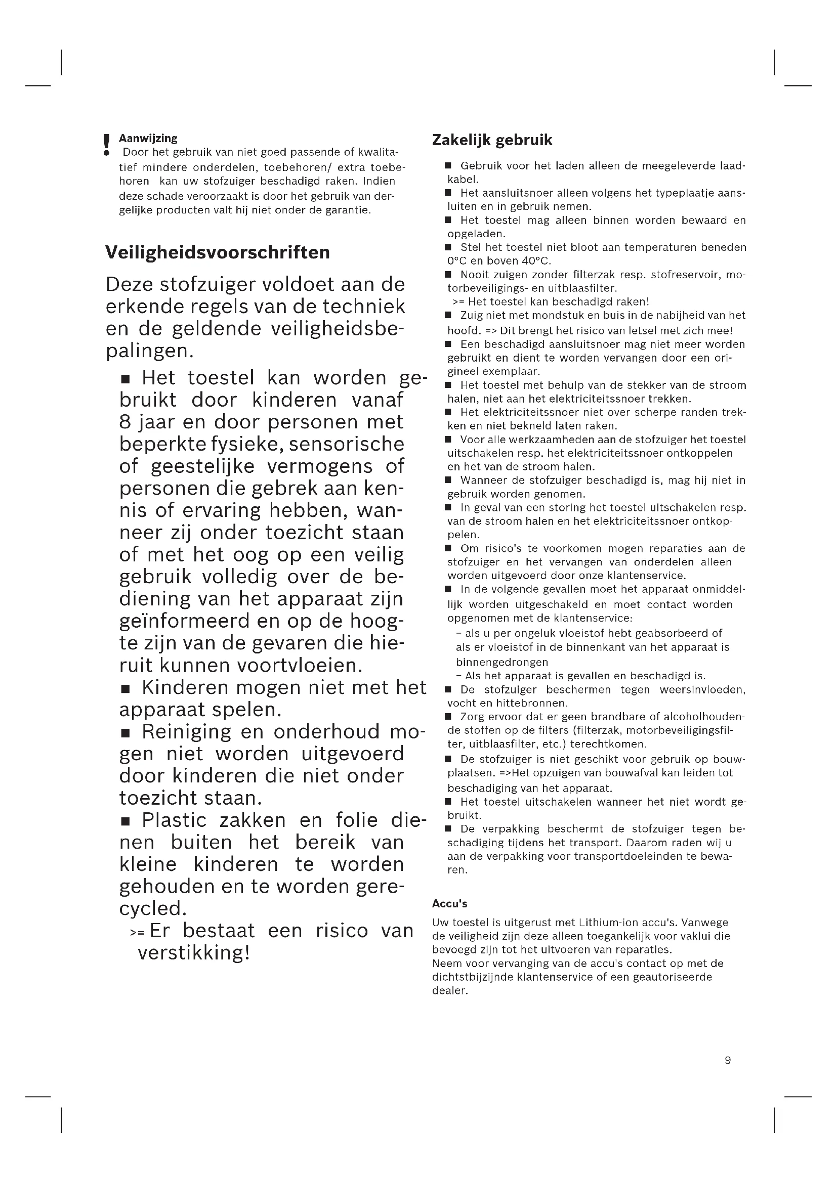 Aanwijzing Door het gebruik van niet goed passende of kwalita-tief mindere onderdelen, toebehoren/ extra toebe-horen kan uw stofzuiger beschadigd raken. Indien deze schade veroorzaakt is door het gebruik van der-gelijke producten valt hij niet onder de garantie. Veiligheidsvoorschriften Deze stofzuiger voldoet aan de erkende regels van de techniek en de geldende veiligheidsbe- palingen. Het toestel kan worden ge- bruikt door kinderen vanaf 8 jaar en door personen met beperkte fysieke, sensorische of geestelijke vermogens of personen die gebrek aan ken- nis of ervaring hebben, wan- neer zij onder toezicht staan of met het oog op een veilig gebruik volledig over de be- diening van het apparaat zijn geïnformeerd en op de hoog- te zijn van de gevaren die hie- ruit kunnen voortvloeien. Kinderen mogen niet met het apparaat spelen. Reiniging en onderhoud mo- gen niet worden uitgevoerd door kinderen die niet onder toezicht staan. Plastic zakken en folie die- nen buiten het bereik van kleine kinderen te worden gehouden en te worden gere- cycled. >= Er bestaat een risico van verstikking! Zakelijk gebruik Gebruik voor het laden alleen de meegeleverde laad-kabel. Het aansluitsnoer alleen volgens het typeplaatje aans-luiten en in gebruik nemen. Het toestel mag alleen binnen worden bewaard en opgeladen. Stel het toestel niet bloot aan temperaturen beneden 0°C en boven 40°C. Nooit zuigen zonder filterzak resp. stofreservoir, mo-torbeveiligings- en uitblaasfilter.>= Het toestel kan beschadigd raken! Zuig niet met mondstuk en buis in de nabijheid van het hoofd. => Dit brengt het risico van letsel met zich mee! Een beschadigd aansluitsnoer mag niet meer worden gebruikt en dient te worden vervangen door een ori-gineel exemplaar. Het toestel met behulp van de stekker van de stroom halen, niet aan het elektriciteitssnoer trekken. Het elektriciteitssnoer niet over scherpe randen trek-ken en niet bekneld laten raken. Voor alle werkzaamheden aan de stofzuiger het toestel uitschakelen resp. het elektriciteitssnoer ontkoppelen en het van de stroom halen. Wanneer de stofzuiger beschadigd is, mag hij niet in gebruik worden genomen. In geval van een storing het toestel uitschakelen resp. van de stroom halen en het elektriciteitssnoer ontkop-pelen. Om risico's te voorkomen mogen reparaties aan de stofzuiger en het vervangen van onderdelen alleen worden uitgevoerd door onze klantenservice. In de volgende gevallen moet het apparaat onmiddel-lijk worden uitgeschakeld en moet contact worden opgenomen met de klantenservice: − als u per ongeluk vloeistof hebt geabsorbeerd of als er vloeistof in de binnenkant van het apparaat is binnengedrongen − Als het apparaat is gevallen en beschadigd is. De stofzuiger beschermen tegen weersinvloeden, vocht en hittebronnen. Zorg ervoor dat er geen brandbare of alcoholhouden-de stoffen op de filters (filterzak, motorbeveiligingsfil-ter, uitblaasfilter, etc.) terechtkomen. De stofzuiger is niet geschikt voor gebruik op bouw-plaatsen. =>Het opzuigen van bouwafval kan leiden tot beschadiging van het apparaat. Het toestel uitschakelen wanneer het niet wordt ge-bruikt. De verpakking beschermt de stofzuiger tegen be-schadiging tijdens het transport. Daarom raden wij u aan de verpakking voor transportdoeleinden te bewa- ren. Accu'sUw toestel is uitgerust met Lithium-ion accu's. Vanwege de veiligheid zijn deze alleen toegankelijk voor vaklui die bevoegd zijn tot het uitvoeren van reparaties.Neem voor vervanging van de accu's contact op met de dichtstbijzijnde klantenservice of een geautoriseerde dealer.10 Opbevar brugsanvisningen.Sørg for, at brugsanvisningen medfølger, hvis støvsuge-ren gives videre til andre. Anvendelse iht. formål Dette apparat er kun beregnet til anvendelse i private husholdninger og i hjemmet. Dette apparat er beregnet til brug i en højde på op til maksimalt 2000 meter over havets overflade. Støvsugeren må udelukkende an-vendes i overensstemmelse med angivelserne i denne brugsanvisning.For at undgå tilskadekomst og beskadigelser må støv-sugeren ikke benyttes til: Støvsugning af mennesker eller dyr. Opsugning af: − Sundhedsskadelige, skarpe, varme eller glødende substanser. − Fugtige eller flydende substanser. − Letantændelige eller eksplosive stoffer og gasser. − Aske, sod fra brændeovne og centralvarmeanlæg. − Tonerstøv fra printere eller kopimaskiner. Reservedele, tilbehør Vores originale reservedele, vores originale tilbehør og tilbehør er nøje tilpasset vores støvsugers egenskaber og krav. Derfor anbefaler vi kun at bruge vores originale reservedele, vores originale tilbehør og tilbehør. Dette sikrer en lang levetid for støvsugeren og en konsekvent høj rengørings kvalitet. Bemærk Anvendelse af reservedele / ekstra tilbehør som ikke passer eller er af dårlig kvalitet, kan medføre skader på støvsugeren, som ikke er omfattet af vores garan-ti, hvis disse skader netop er forårsaget af anvendel-sen af sådanne produkter. Sikkerhedsanvisninger Denne støvsuger opfylder de anerkendte tekniske standar- der og de relevante sikkerheds- bestemmelser. Dette apparat kan benyttes af børn fra 8 år og derover, samt af personer med reducerede fysiske, sensoriske eller men- tale evner og / eller manglen- de erfaring eller viden, hvis de er under opsigt eller er blevet