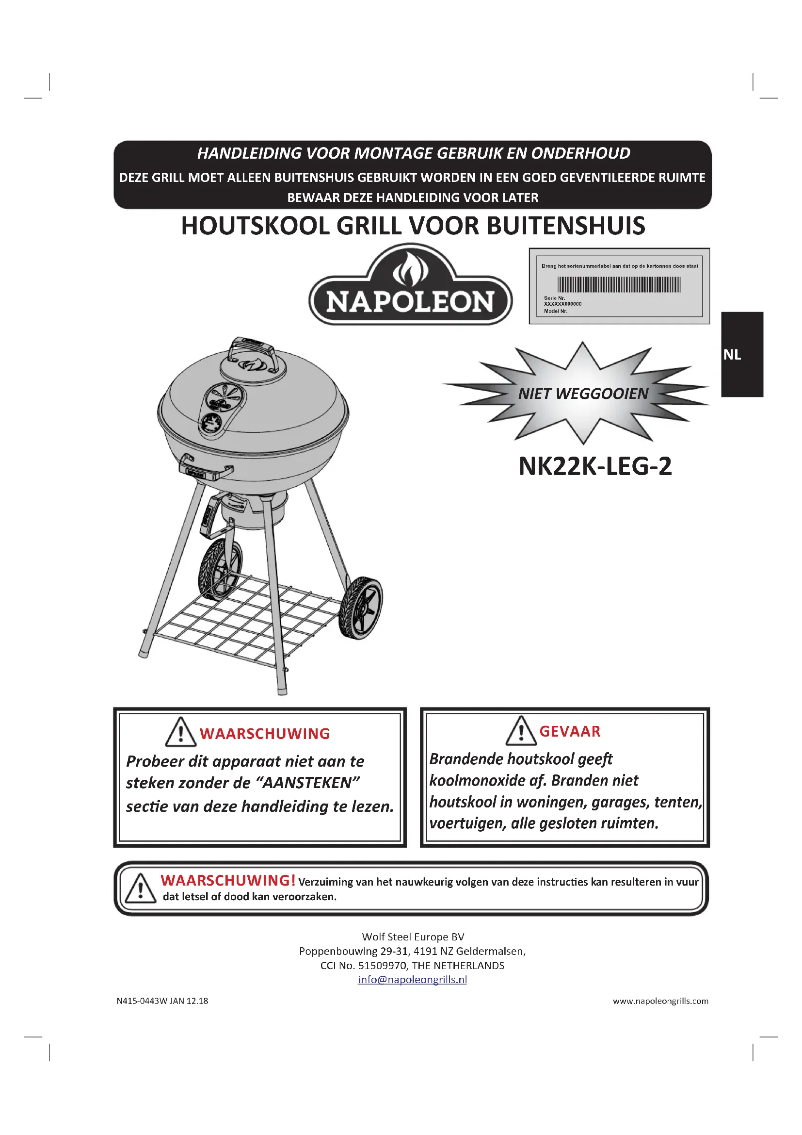 Breng het serienummerlabel aan dat op de kartonnen doos staatSerie Nr. XXXXXX000000Model Nr. WAARSCHUWING Probeer dit apparaat niet aan te steken zonder de “AANSTEKEN” sece van deze handleiding te lezen. Wolf Steel Europe BV Poppenbouwing 29-31, 4191 NZ Geldermalsen,CCI No. 51509970, THE NETHERLANDSinfo@napoleongrills.nl NIET WEGGOOIEN NK22K-LEG-226