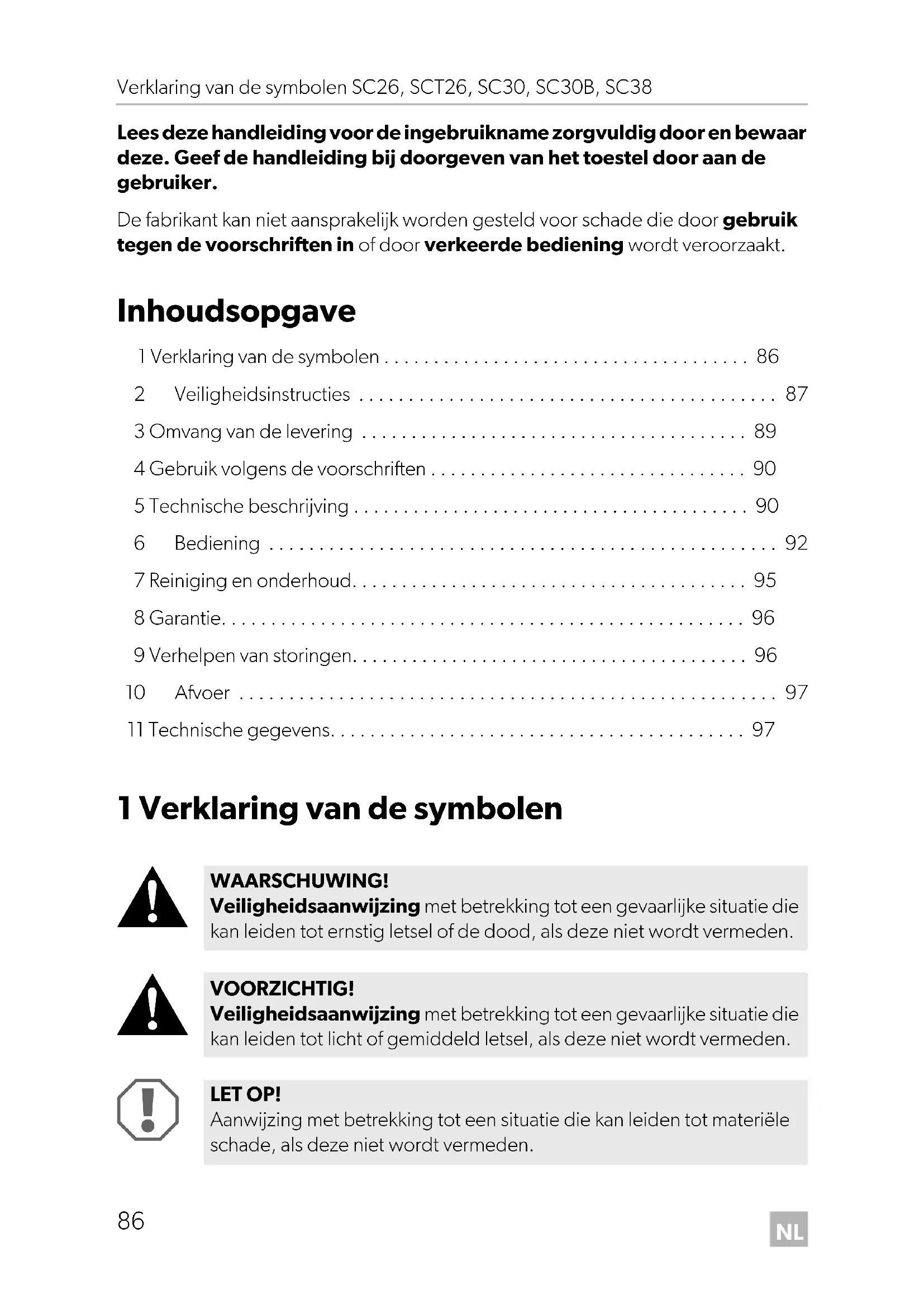 WAARSCHUWING! Veiligheidsaanwijzing met betrekking tot een gevaarlijke situatie die kan leiden tot ernstig letsel of de dood, als deze niet wordt vermeden. VOORZICHTIG! Veiligheidsaanwijzing met betrekking tot een gevaarlijke situatie die kan leiden tot licht of gemiddeld letsel, als deze niet wordt vermeden. LET OP! Aanwijzing met betrekking tot een situatie die kan leiden tot materiële schade, als deze niet wordt vermeden. SC26-SCT26-SC30-SC38_OPM_EMEA16.book Seite 86 Mittwoch, 19. Juni 2019 8:51 20NL SC26, SCT26, SC30, SC30B, SC38 Veiligheidsinstructies