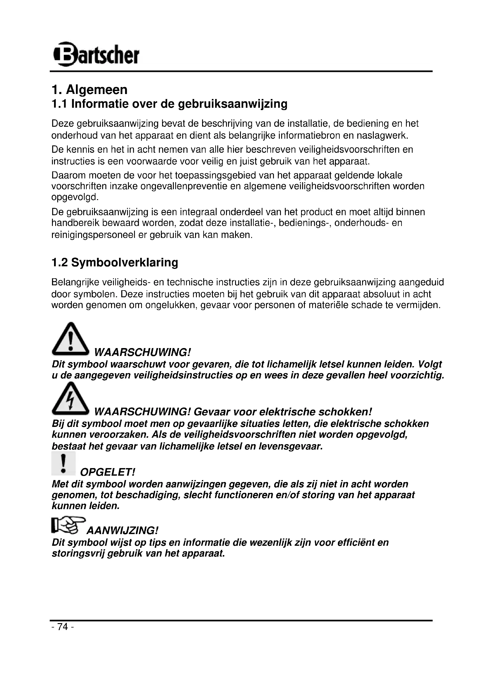 Belangrijke veiligheids- en technische instructies zijn in deze gebruiksaanwijzing aangeduid door symbolen. Deze instructies moeten bij het gebruik van dit apparaat absoluut in acht worden genomen om ongelukken, gevaar voor personen of materiële schade te vermijden. WAARSCHUWING! Dit symbool waarschuwt voor gevaren, die tot lichamelijk letsel kunnen leiden. Volgt u de aangegeven veiligheidsinstructies op en wees in deze gevallen heel voorzichtig. WAARSCHUWING! Gevaar voor elektrische schokken! Bij dit symbool moet men op gevaarlijke situaties letten, die elektrische schokken kunnen veroorzaken. Als de veiligheidsvoorschriften niet worden opgevolgd, bestaat het gevaar van lichamelijke letsel en levensgevaar. OPGELET! Met dit symbool worden aanwijzingen gegeven, die als zij niet in acht worden genomen, tot beschadiging, slecht functioneren en/of storing van het apparaat kunnen leiden. AANWIJZING! Dit symbool wijst op tips en informatie die wezenlijk zijn voor efficiënt en storingsvrij gebruik van het apparaat.- 75 -