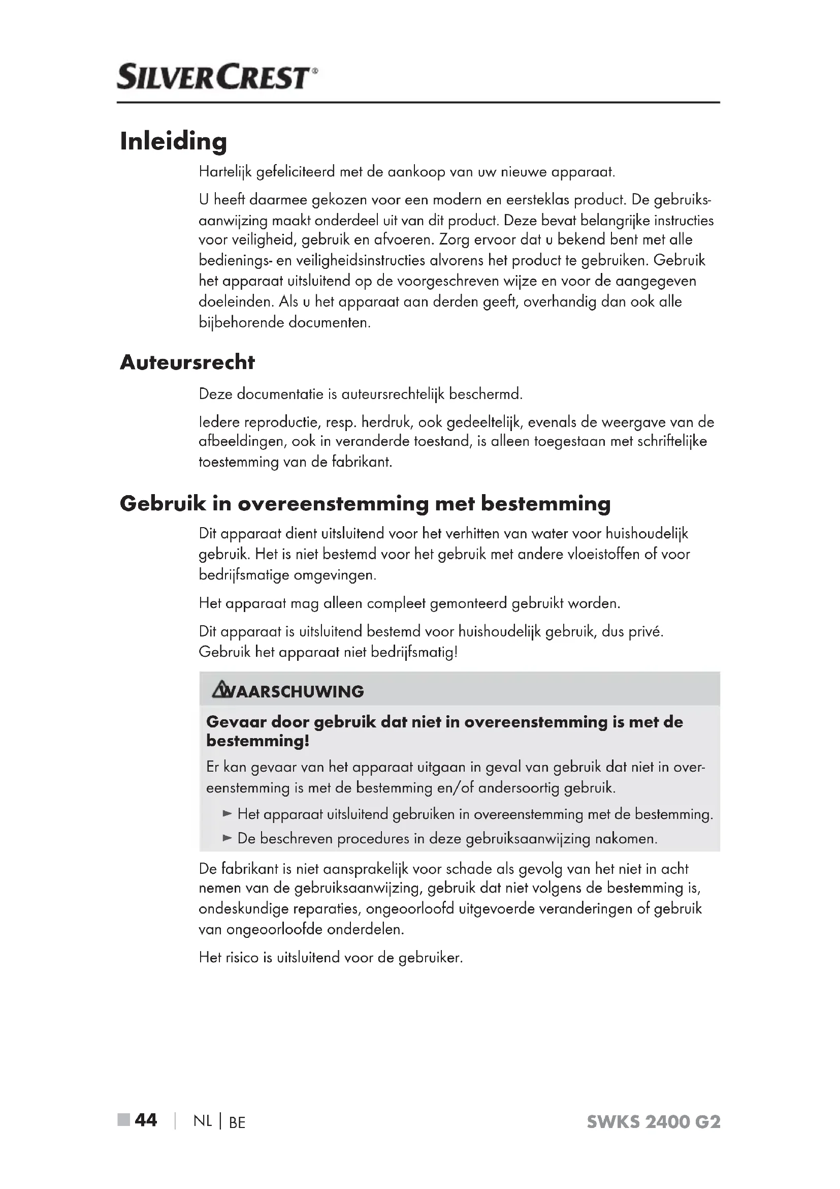 Inleiding Hartelijk gefeliciteerd met de aankoop van uw nieuwe apparaat. U heeft daarmee gekozen voor een modern en eersteklas product. De gebruiks- aanwijzing maakt onderdeel uit van dit product. Deze bevat belangrijke instructies voor veiligheid, gebruik en afvoeren. Zorg ervoor dat u bekend bent met alle bedienings- en veiligheidsinstructies alvorens het product te gebruiken. Gebruik het apparaat uitsluitend op de voorgeschreven wijze en voor de aangegeven doeleinden. Als u het apparaat aan derden geeft, overhandig dan ook alle bijbehorende documenten. Auteursrecht Deze documentatie is auteursrechtelijk beschermd. Iedere reproductie, resp. herdruk, ook gedeeltelijk, evenals de weergave van de afbeeldingen, ook in veranderde toestand, is alleen toegestaan met schriftelijke toestemming van de fabrikant. Gebruik in overeenstemming met bestemming Dit apparaat dient uitsluitend voor het verhitten van water voor huishoudelijk gebruik. Het is niet bestemd voor het gebruik met andere vloeistoffen of voor bedrijfsmatige omgevingen. Het apparaat mag alleen compleet gemonteerd gebruikt worden. Dit apparaat is uitsluitend bestemd voor huishoudelijk gebruik, dus privé. Gebruik het apparaat niet bedrijfsmatig! WAARSCHUWING Gevaar door gebruik dat niet in overeenstemming is met de bestemming! Er kan gevaar van het apparaat uitgaan in geval van gebruik dat niet in over- eenstemming is met de bestemming en/of andersoortig gebruik. ► Het apparaat uitsluitend gebruiken in overeenstemming met de bestemming. ► De beschreven procedures in deze gebruiksaanwijzing nakomen. De fabrikant is niet aansprakelijk voor schade als gevolg van het niet in acht nemen van de gebruiksaanwijzing, gebruik dat niet volgens de bestemming is, ondeskundige reparaties, ongeoorloofd uitgevoerde veranderingen of gebruik van ongeoorloofde onderdelen. Het risico is uitsluitend voor de gebruiker.SWKS 2400 G2