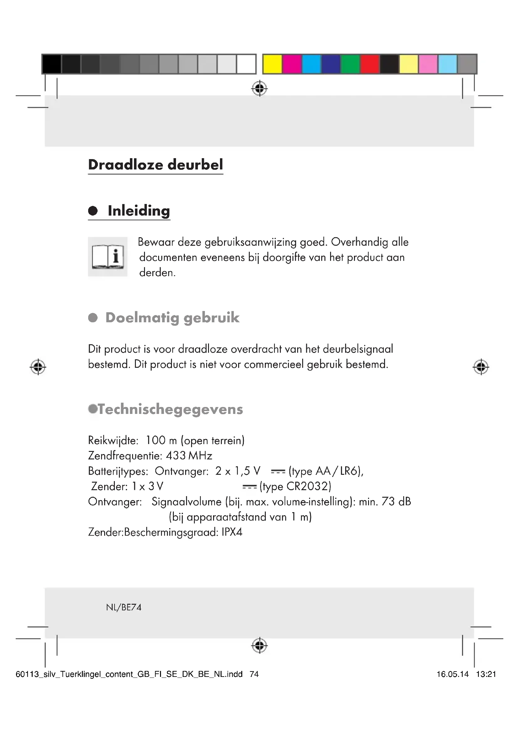 Doelmatig gebruik Dit product is voor draadloze overdracht van het deurbelsignaal bestemd. Dit product is niet voor commercieel gebruik bestemd. Technische gegevens Reikwijdte: 100 m (open terrein) Zendfrequentie: 433 MHz Batterijtypes: Ontvanger: 2 x 1,5 V (type AA / LR6), Zender: 1 x 3 V (type CR2032) Ontvanger: Signaalvolume (bij. max. volume-instelling): min. 73 dB (bij apparaatafstand van 1 m) Zender: Beschermingsgraad: IPX4 60113_silv_Tuerklingel_content_GB_FI_SE_DK_BE_NL.indd 74 16.05.14 13:21NL/BE 75 Leveringsomvang 1 zender 1 ontvanger 1 standvoet (voor de ontvanger) 2 batterijen 1,5 V , type AA (ontvanger) 1 batterij 3 V , type CR2032 (zender) 3 schroeven (voor de zender en voor de wandmontage van de ontvanger) 3 pluggen 5 vervangbare naambordjes (voor de deurbel) 1 deurbelafdekking 1 gebruiksaanwijzing Overzicht van de onderdelen Ontvanger (afb. A / B):