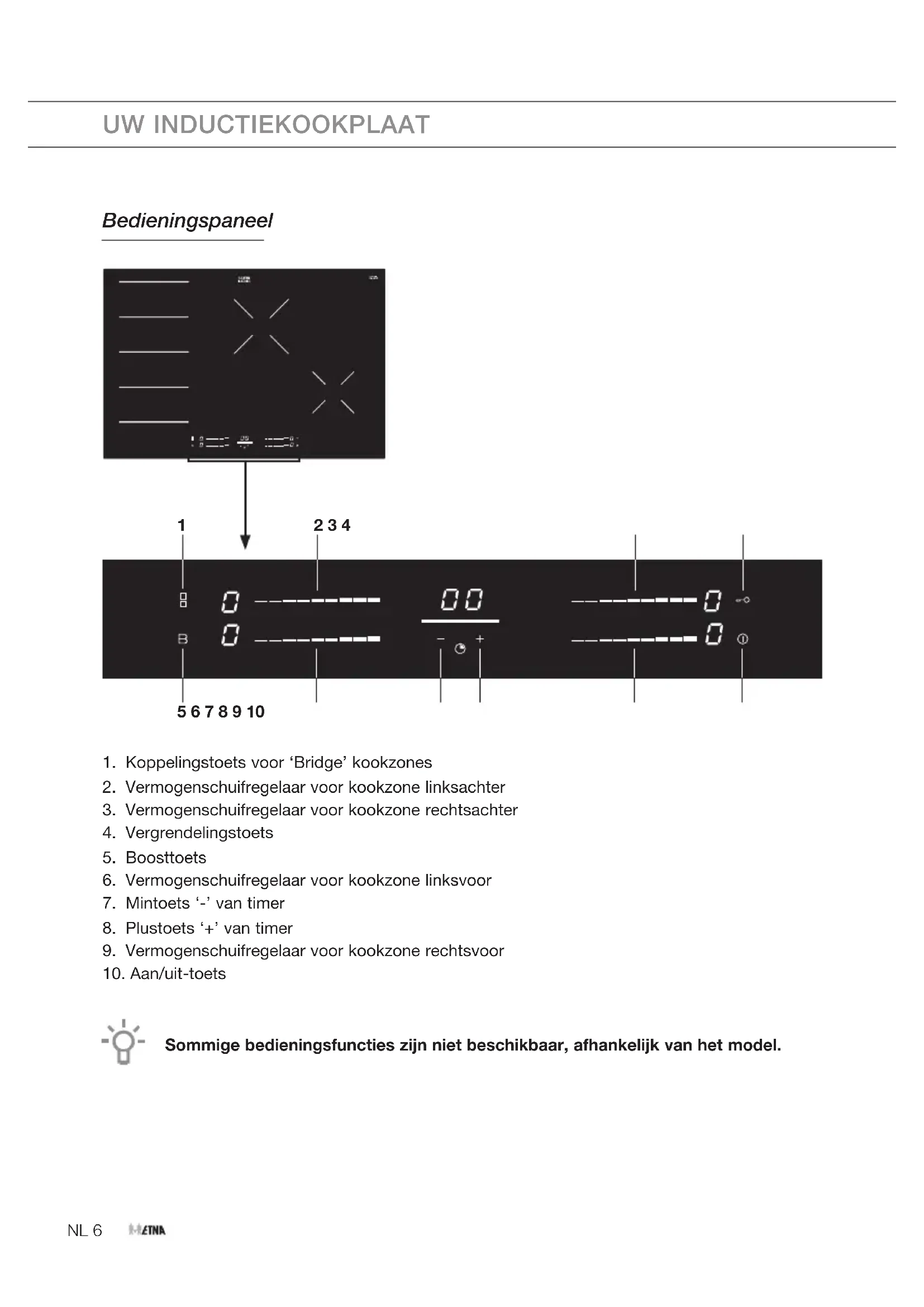 - Gebruik een glasschraper om overgebleven voedselresten, gesmolten kunststof of suiker te verwijderen. Gebruik geen bijtende reinigingsmiddelen; deze kunnen krassen veroorzaken. Gebruik geen staalwol, schuursponsjes of andere scherpe voorwerpen om het apparaat te reinigen. ONDERHOUDNL 20 Algemeen Wanneer u een barst in de glasplaat ziet (hoe klein ook), schakelt u de kookplaat onmiddellijk uit, haalt u stekker uit het stopcontact of zet u de (automatische) zekering(en) in de meterkast uit. Zet bij een permanente aansluiting de schakelaar in de leiding van de stroomvoorziening op nul. Neem contact op met de serviceafdeling. Probleemoplossingstabel Als het apparaat niet naar behoren werkt, betekent dit niet altijd dat het defect is. Probeer het probleem eerst zelf op te lossen door de onderstaande punten na te lopen. U kunt voor meer informatie ook terecht op de website www.etna.nl. Symptoom Mogelijke oorzaak Oplossing Het display gaat branden wanneer de kookplaat de eerste keer wordt ingeschakeld. Dit is de normale opstartroutine. Normale werking. De ventilator blijft nog enkele minuten doorwerken nadat de kookplaat is uitgeschakeld. De kookplaat koelt af. Normale werking. In het begin is het mogelijk dat u een lichte geur ruikt. Het nieuwe apparaat wordt opgewarmd. Dit is normaal en verdwijnt nadat het apparaat een aantal keer is gebruikt. Ventileer de keuken. De pannen maken geluid tijdens het koken. Dit wordt veroorzaakt door de energie die van de kookplaat naar de pan stroomt. Bij hoge instellingen is dit bij bepaalde pannen een heel normaal verschijnsel. Dit is niet schadelijk voor de pannen of de kookplaat. U hebt een kookzone ingeschakeld maar het display toont ‘u’. De gebruikte pan is niet geschikt voor inductiekoken of heeft een diameter van minder dan 12 cm. Gebruik een geschikte pan. Een kookzone stopt plotseling en u hoort een signaal. De vooraf ingestelde tijd is verstreken. Schakel het alarm uit door de toets ‘+’ van de timer aan te raken. De kookplaat werkt niet en er verschijnt niets op het display. Er is geen stroom vanwege een defecte kabel of defecte aansluiting. Controleer de zekeringen en de elektriciteitsschakelaar (als er geen stekker is). PROBLEMEN OPLOSSENNL 21 Symptoom Mogelijke oorzaak Oplossing Bij het inschakelen van de kookplaat slaat er een stop door. Foutieve elektrische aansluiting. Controleer de elektrische aansluitingen. De symbolen voor brugzonekoppeling worden op de displays weergegeven. De schuifregelaar werkt niet. De koppelfunctie van de brugzone is geactiveerd. Deactiveer de koppelfunctie van de brugzone. Foutcode E1 of E2. Voedingsspanning of -frequentie wijkt af van de nominale waarden. Neem contact op met een erkende installateur. Foutcode E3 of E4. Interne temperatuur van de kookplaat is te hoog. Schakel de kookplaat uit en laat deze afkoelen (H verdwijnt van de displays). Schakel de kookplaat in. Als dezelfde fout opnieuw wordt weergegeven, neemt u contact op met een erkende servicemedewerker. Foutcode E5 of E6. Interne temperatuur van kookplaat is te hoog. Controleer of de kookplaat voldoende ventilatie heeft en of deze op de juiste manier is ingebouwd. Laat de kookplaat afkoelen en probeer deze opnieuw te starten. Controleer of de ventilator goed werkt; zo niet, neem dan contact op met een servicemonteur. Overige foutcodes. Defecte generator. Neem contact op met de serviceafdeling. PROBLEMEN OPLOSSENNL 22 TECHNISCHE SPECIFICATIES Informatie volgens verordening (EU) 66/2014 Metingen volgens EN60350-2 Modelaanduiding