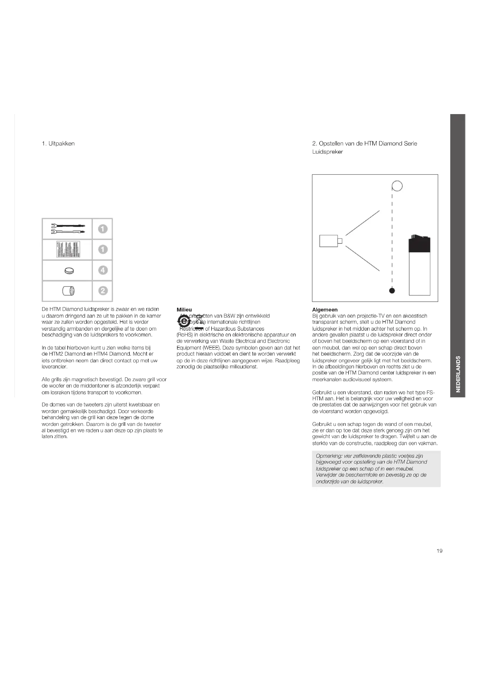 De HTM Diamond luidspreker is zwaar en we raden u daarom dringend aan ze uit te pakken in de kamer waar ze zullen worden opgesteld. Het is verder verstandig armbanden en dergelijke af te doen om beschadiging van de luidsprekers te voorkomen. In de tabel hierboven kunt u zien welke items bij de HTM2 Diamond en HTM4 Diamond. Mocht er iets ontbreken neem dan direct contact op met uw leverancier. Alle grills zijn magnetisch bevestigd. De zware grill voor de woofer en de middentoner is afzonderlijk verpakt om losraken tijdens transport te voorkomen. De domes van de tweeters zijn uiterst kwetsbaar en worden gemakkelijk beschadigd. Door verkeerde behandeling van de grill kan deze tegen de dome worden getrokken. Daarom is de grill van de tweeter al bevestigd en we raden u aan deze op zijn plaats te laten zitten. Milieu Alle producten van B&W zijn ontwikkeld conform de internationale richtlijnen Restriction of Hazardous Substances (RoHS) in elektrische en elektronische apparatuur en de verwerking van Waste Electrical and Electronic Equipment (WEEE). Deze symbolen geven aan dat het product hieraan voldoet en dient te worden verwerkt op de in deze richtlijnen aangegeven wijze. Raadpleeg zonodig de plaatselijke milieudienst. Algemeen Bij gebruik van een projectie-TV en een akoestisch transparant scherm, stelt u de HTM Diamond luidspreker in het midden achter het scherm op. In andere gevallen plaatst u de luidspreker direct onder of boven het beeldscherm op een vloerstand of in een meubel, dan wel op een schap direct boven het beeldscherm. Zorg dat de voorzijde van de luidspreker ongeveer gelijk ligt met het beeldscherm. In de afbeeldingen hierboven en rechts ziet u de positie van de HTM Diamond center luidspreker in een meerkanalen audiovisueel systeem. Gebruikt u een vloerstand, dan raden we het type FS- HTM aan. Het is belangrijk voor uw veiligheid en voor de prestaties dat de aanwijzingen voor het gebruik van de vloerstand worden opgevolgd. Gebruikt u een schap tegen de wand of een meubel, zie er dan op toe dat deze sterk genoeg zijn om het gewicht van de luidspreker te dragen. Twijfelt u aan de sterkte van de constructie, raadpleeg dan een vakman. Opmerking: vier zelfklevende plastic voetjes zijn bijgevoegd voor opstelling van de HTM Diamond luidspreker op een schap of in een meubel. Verwijder de beschermfolie en bevestig ze op de onderzijde van de luidspreker.20 NEDERLANDS