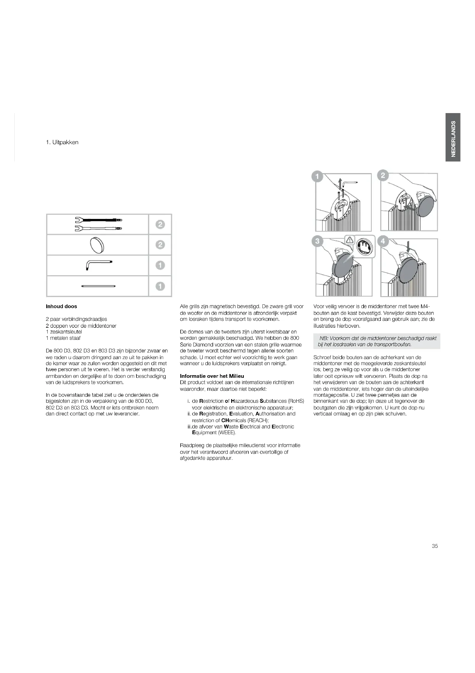 Inhoud doos 2 paar verbindingsdraadjes 2 doppen voor de middentoner 1 zeskantsleutel 1 metalen staaf De 800 D3, 802 D3 en 803 D3 zijn bijzonder zwaar en we raden u daarom dringend aan ze uit te pakken in de kamer waar ze zullen worden opgesteld en dit met twee personen uit te voeren. Het is verder verstandig armbanden en dergelijke af te doen om beschadiging van de luidsprekers te voorkomen. In de bovenstaande tabel ziet u de onderdelen die bijgesloten zijn in de verpakking van de 800 D3, 802D3 en 803 D3. Mocht er iets ontbreken neem dandirect contact op met uw leverancier. Alle grills zijn magnetisch bevestigd. De zware grill voor de woofer en de middentoner is afzonderlijk verpakt om losraken tijdens transport te voorkomen. De domes van de tweeters zijn uiterst kwetsbaar en worden gemakkelijk beschadigd. We hebben de 800 Serie Diamond voorzien van een stalen grille waarmee de tweeter wordt beschermd tegen allerlei soorten schade. U moet echter wel voorzichtig te werk gaan wanneer u de luidsprekers verplaatst en reinigt. Informatie over het Milieu Dit product voldoet aan de internationale richtlijnen waaronder, maar daartoe niet beperkt: