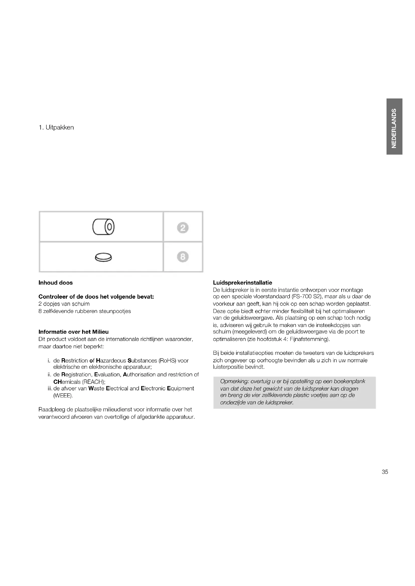(WEEE). Raadpleeg de plaatselijke milieudienst voor informatie over het verantwoord afvoeren van overtollige of afgedankte apparatuur. Luidsprekerinstallatie De luidspreker is in eerste instantie ontworpen voor montage op een speciale vloerstandaard (FS-700S2), maar als u daar de voorkeur aan geeft, kan hij ook op een schap worden geplaatst. Deze optie biedt echter minder exibiliteit bij het optimaliseren van de geluidsweergave. Als plaatsing op een schap toch nodig is, adviseren wij gebruik te maken van de insteekdopjes van schuim (meegeleverd) om de geluidsweergave via de poort te optimaliseren (zie hoofdstuk 4: Fijnafstemming). Bij beide installatieopties moeten de tweeters van de luidsprekers zich ongeveer op oorhoogte bevinden als u zich in uw normale luisterpositie bevindt. Opmerking:overtuiguerbijopstellingopeenboekenplank vandatdezehetgewichtvandeluidsprekerkandragen enbrengdevierzelfklevendeplasticvoetjesaanopde onderzijdevandeluidspreker. NEDERLANDS Contents NEDERLANDS 4