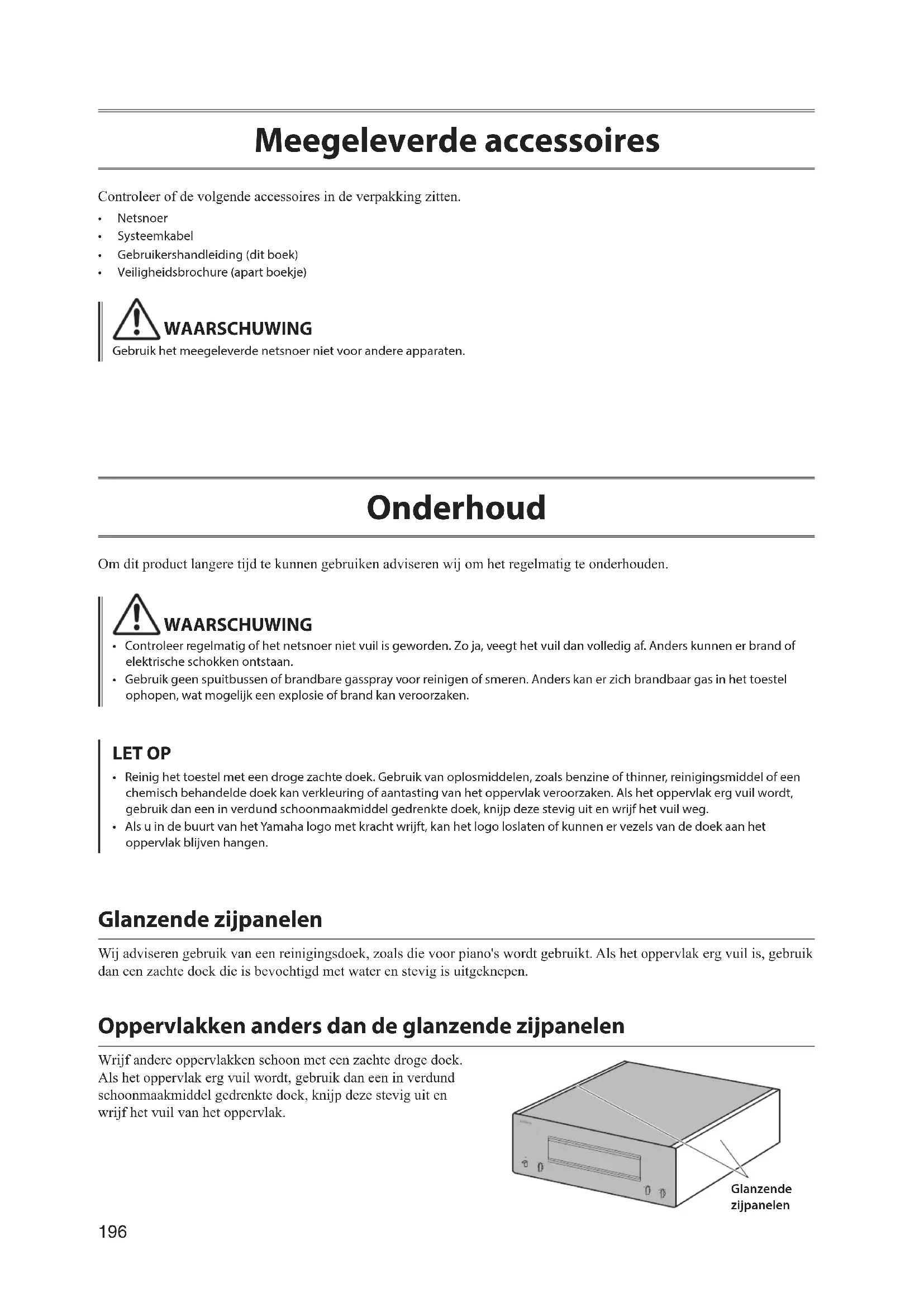 - Netsnoer• Systeemkabel• Gebruikershandleiding (dit boek)• Veiligheidsbrochure (apart boekje) WAARSCHUWING Gebruik het meegeleverde netsnoer niet voor andere apparaten. Onderhoud Om dit product langere tijd te kunnen gebruiken adviseren wij om het regelmatig te onderhouden. WAARSCHUWING