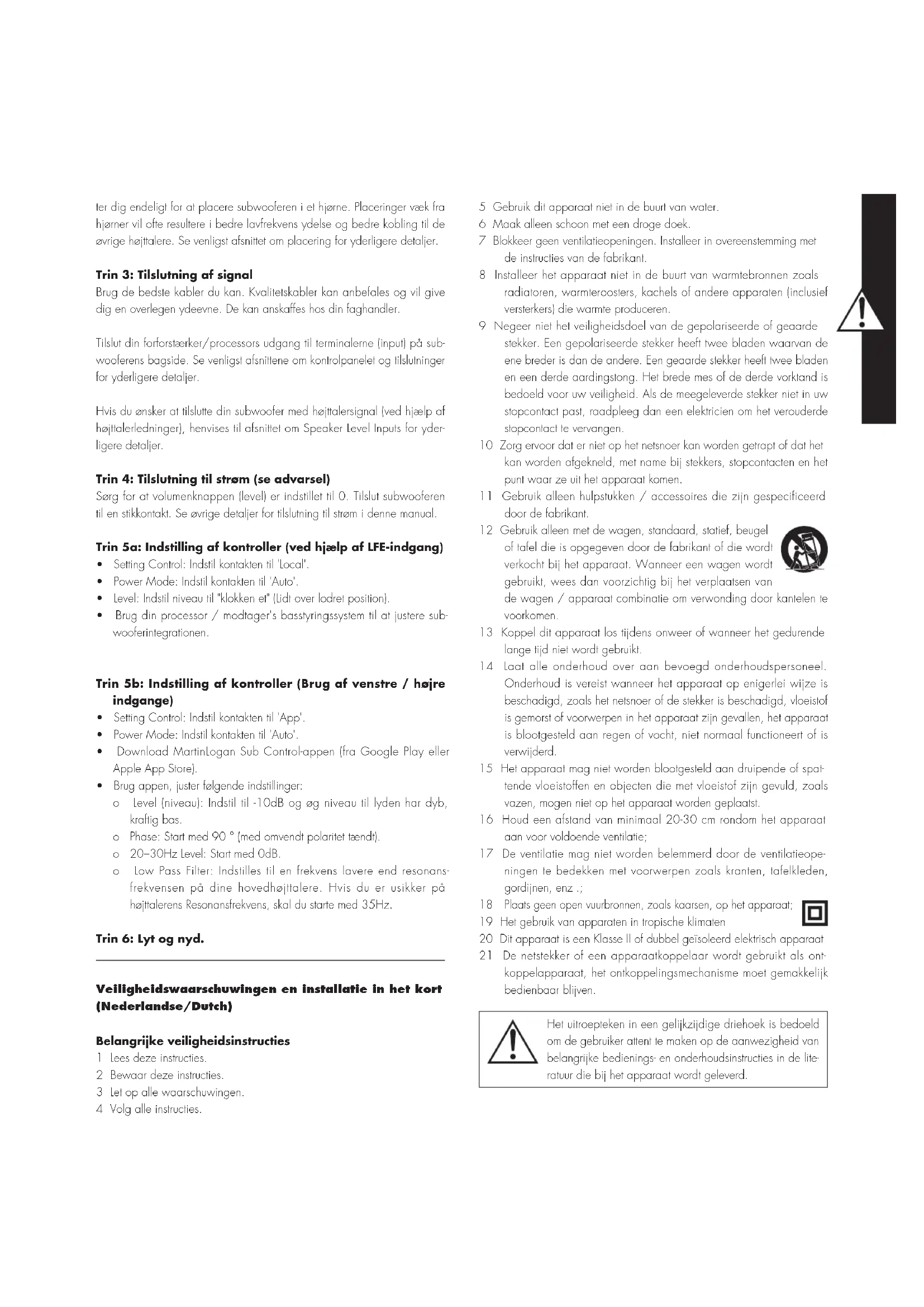 - Brug appen, juster følgende indstillinger: o Level (niveau): Indstil til -10dB og øg niveau til lyden har dyb, kraftig bas. o Phase: Start med 90 ° (med omvendt polaritet tændt). o 20–30Hz Level: Start med 0dB. o Low Pass Filter: Indstilles til en frekvens lavere end resonans- frekvensen på dine hovedhøjttalere. Hvis du er usikker på højttalerens Resonansfrekvens, skal du starte med 35Hz. Trin 6: Lyt og nyd. Veiligheidswaarschuwingen en installatie in het kort (Nederlandse/Dutch) Belangrijke veiligheidsinstructies 1 Lees deze instructies. 2 Bewaar deze instructies. 3 Let op alle waarschuwingen. 4 Volg alle instructies. 5 Gebruik dit apparaat niet in de buurt van water. 6 Maak alleen schoon met een droge doek. 7 Blokkeer geen ventilatieopeningen. Installeer in overeenstemming met de instructies van de fabrikant. 8 Installeer het apparaat niet in de buurt van warmtebronnen zoals radiatoren, warmteroosters, kachels of andere apparaten (inclusief versterkers) die warmte produceren. 9 Negeer niet het veiligheidsdoel van de gepolariseerde of geaarde stekker. Een gepolariseerde stekker heeft twee bladen waarvan de ene breder is dan de andere. Een geaarde stekker heeft twee bladen en een derde aardingstong. Het brede mes of de derde vorktand is bedoeld voor uw veiligheid. Als de meegeleverde stekker niet in uw stopcontact past, raadpleeg dan een elektricien om het verouderde stopcontact te vervangen. 10 Zorg ervoor dat er niet op het netsnoer kan worden getrapt of dat het kan worden afgekneld, met name bij stekkers, stopcontacten en het punt waar ze uit het apparaat komen. 11 Gebruik alleen hulpstukken / accessoires die zijn gespecificeerd door de fabrikant. 12 Gebruik alleen met de wagen, standaard, statief, beugel of tafel die is opgegeven door de fabrikant of die wordt verkocht bij het apparaat. Wanneer een wagen wordt gebruikt, wees dan voorzichtig bij het verplaatsen van de wagen / apparaat combinatie om verwonding door kantelen te voorkomen. 13 Koppel dit apparaat los tijdens onweer of wanneer het gedurende lange tijd niet wordt gebruikt. 14 Laat alle onderhoud over aan bevoegd onderhoudspersoneel. Onderhoud is vereist wanneer het apparaat op enigerlei wijze is beschadigd, zoals het netsnoer of de stekker is beschadigd, vloeistof is gemorst of voorwerpen in het apparaat zijn gevallen, het apparaat is blootgesteld aan regen of vocht, niet normaal functioneert of is verwijderd. 15 Het apparaat mag niet worden blootgesteld aan druipende of spat- tende vloeistoffen en objecten die met vloeistof zijn gevuld, zoals vazen, mogen niet op het apparaat worden geplaatst. 16 Houd een afstand van minimaal 20-30 cm rondom het apparaat aan voor voldoende ventilatie; 17 De ventilatie mag niet worden belemmerd door de ventilatieope- ningen te bedekken met voorwerpen zoals kranten, tafelkleden, gordijnen, enz .;