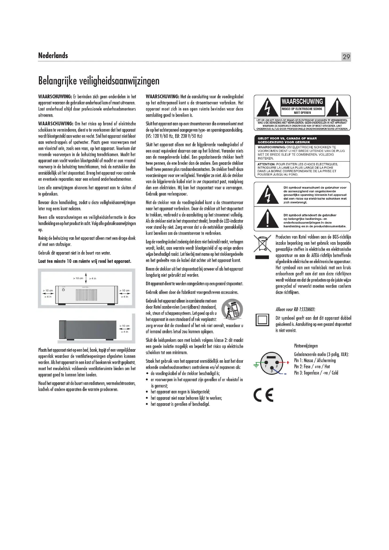 - Pintoewijzingen Gebalanceerde audio (3-polig, XLR): Pin 1: Massa / Afscherming Pin 2: Fase / +ve / Hot Pin 3: Tegenfase / -ve / Cold WAARSCHUWING RISICO OP ELEKTRISCHE SCHOK NIET OPENENLET OP: OM HET RISICO OP BRAND OF ELEKTRISCHE SCHOKKEN TE VERMINDEREN, MAG U DE BEHUIZING NIET VERWIJDEREN. GEEN ONDERDELEN IN HET APPARAAT WAARAAN DE GEBRUIKER ONDERHOUD KAN OF MOET UITVOEREN. LAAT ONDERHOUD ALTIJD DOOR PROFESSIONELE ONDERHOUDSMONTEURS UITVOEREN.GELDT VOOR VS, CANADA OF WAAR GOEDGEKEURD VOOR GEBRUIKWAARSCHUWING: OM ELEKTRISCHE SCHOKKEN TE VOORKOMEN DIENT U HET BREDE UITEINDE VAN DE PLUG MET DE BREDE SLEUF TE COMBINEREN. VOLLEDIG INSTEKEN. Dit symbool waarschuwt de gebruiker voor de aanwezigheid van ongeïsoleerde gevaarlijke spanning binnenin het apparaat dat een risico op elektrische schokken met zich meebrengt. Dit symbool attendeert de gebruiker op belangrijke bedienings- en onderhoudsaanwijzingen in deze handleiding en in de productdocumentatie.30 Stereo vermogensversterkers RB-1552MKII/RB-1582MKII Over Rotel Ons verhaal is meer dan 50 jaar geleden begonnen. Door de jaren heen hebben we met onze producten honderden prijzen gewonnen en hebben honderdduizenden mensen van onze producten kunnen genieten. Mensen die net als u hoogwaardige apparatuur voor home-entertainment op waarde weten te schatten. Rotel is opgericht door een familie met een passie voor muziek die hifi- apparatuur van de allerhoogste kwaliteit is gaan maken. Na al die jaren is die passie er nog steeds. Nog altijd is ons doel meerwaarde bieden aan muziekliefhebbers en hifi-kenners, ongeacht hun budget. Dit doel wordt gedeeld door alle medewerkers van Rotel. De ontwikkelaars van Rotel werken als één team samen. Ze luisteren zorgvuldig naar elk nieuw product en blijven het bijschaven tot het aan hun hoge eisen voldoet. Ze kunnen componenten van overal ter wereld kiezen om het optimale product te maken, zoals condensatoren uit het Verenigd Koninkrijk en Duitsland, halfgeleiders uit Japan of de VS, terwijl de ringkerntransformatoren altijd in Rotels eigen fabrieken worden vervaardigd. Het milieu gaat ons allemaal aan het hart. Omdat er steeds meer elektronica wordt geproduceerd die ooit ook weer zal worden afgedankt, wordt het voor fabrikanten steeds belangrijker er alles aan te doen producten zo te ontwerpen dat deze het milieu zo min mogelijk belasten. Bij Rotel zijn we er trots op dat we hieraan ons steentje kunnen bijdragen. Een voorbeeld daarvan is dat we zijn overgestapt op speciaal soldeermiddel dat voldoet aan de BGS-richtlijn, waardoor er in onze elektronica minder lood wordt verwerkt. En onze nieuwe klasse D-versterkers (niet de D van digitaal) zijn nu vijf keer efficiënter dan hun voorgangers, zonder dat er concessies worden gedaan aan het vermogen of de prestaties. Deze producten worden niet heet, verspillen vrijwel geen energie, zijn goed voor het milieu en klinken ook nog eens beter. En tot slot is deze handleiding op kringlooppapier gedrukt. Wij beseffen dat dit slechts kleine stapjes zijn, maar ze zijn wel belangrijk. En wij blijven naar nieuwe methoden en materialen zoeken om nog schoner en groener te kunnen produceren. Namens Rotel willen wij u bedanken dat u dit product hebt aangeschaft. Wij weten zeker dat u er vele jaren plezier van zult hebben. Over wattage Het uitgangsvermogen dat gegeven wordt voor de RB-1552MKII is 130 watt per kanaal, voor de RB-1582MKII is dat 200 watt per kanaal, als alle vijf de kanalen op vol vermogen in bedrijf zijn. Rotel heeft ervoor gekozen om het uitgangsvermogen op deze manier aan te geven omdat Rotel de ervaring heeft dat dit de meest nauwkeurige aanduiding van het vermogen van een receiver of versterker oplevert. Als u de specificaties voor verschillende producten wilt vergelijken, houd er dan rekening mee dat het uitgangsvermogen niet altijd op dezelfde manier wordt aangegeven, waardoor het dus mogelijk is dat u niet dezelfde waarden met elkaar vergelijkt. Het uitgangsvermogen kan bijvoorbeeld worden aangegeven voor slechts één kanaal in bedrijf, hetgeen een hogere maximumwaarde oplevert. Door het hoge vermogen van de voeding leveren de versterkers van Rotel zeker het volledige opgegeven uitgangsvermogen op één of beide kanalen. De impedantie van een luidspreker geeft de elektrische weerstand of belasting aan die de luidspreker biedt als hij op de versterker wordt aangesloten. Meestal is dit 8 ohm of 4 ohm. Hoe lager de impedantie, des te meer vermogen de luidspreker nodig heeft. Een luidspreker van 4 ohm vraagt tweemaal zo veel vermogen als een luidspreker van 8 ohm. De versterkers van Rotel kunnen echter alle luidsprekerimpedanties van 8 tot 4 ohm aan, waarbij alle kanalen op vol vermogen kunnen werken. Omdat het ontwerp van Rotel geoptimaliseerd is voor gebruikssituaties waarbij alle kanalen samenwerken, kan Rotel het echte uitgangsvermogen voor beide kanalen vermelden. Dit kan ook van belang zijn voor uw geluidservaring. Als u een film kijkt, is het bijvoorbeeld belangrijk dat de versterker het geluid over alle kanalen tegelijkertijd op vol vermogen kan reproduceren, vooral als er een vulkaan uitbarst! Inhoud Afbeelding 1: Bedieningselementen en aansluitingen 3 Afbeelding 2: Analoge ingangen en luidsprekeruitgangen 4 Afbeelding 3: Gebalanceerde ingangen (XLR) 5 Héél belangrijk 6 Belangrijke veiligheidsaanwijzingen p. 29