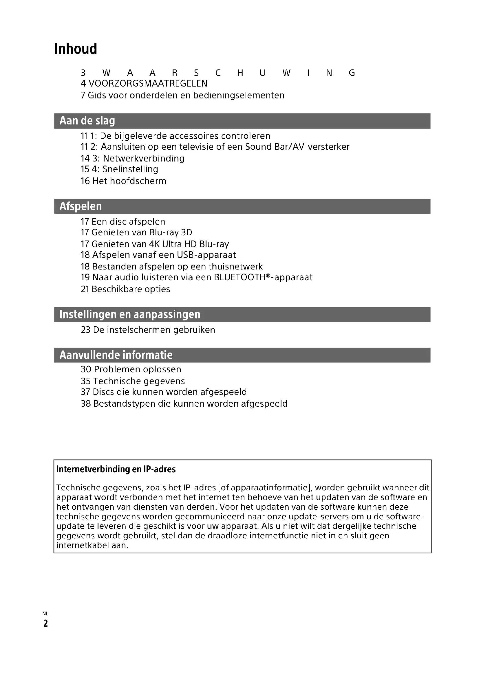 Inhoud 3WAARSCHUWING 4 VOORZORGSMAATREGELEN 7 Gids voor onderdelen en bedieningselementen Aan de slag 11 1: De bijgeleverde accessoires controleren 11 2: Aansluiten op een televisie of een Sound Bar/AV-versterker 14 3: Netwerkverbinding 15 4: Snelinstelling 16 Het hoofdscherm Afspelen 17 Een disc afspelen 17 Genieten van Blu-ray 3D 17 Genieten van 4K Ultra HD Bluray 18 Afspelen vanaf een USB-apparaat 18 Bestanden afspelen op een thuisnetwerk 19 Naar audio luisteren via een BLUETOOTH®-apparaat 21 Beschikbare opties Instellingen en aanpassingen 23 De instelschermen gebruiken Aanvullende informatie 30 Problemen oplossen 35 Technische gegevens 37 Discs die kunnen worden afgespeeld 38 Bestandstypen die kunnen worden afgespeeld Internetverbinding en IP-adres Technische gegevens, zoals het IP-adres [of apparaatinformatie], worden gebruikt wanneer dit apparaat wordt verbonden met het internet ten behoeve van het updaten van de software en het ontvangen van diensten van derden. Voor het updaten van de software kunnen deze technische gegevens worden gecommuniceerd naar onze update-servers om u de software- update te leveren die geschikt is voor uw apparaat. Als u niet wilt dat dergelijke technische gegevens wordt gebruikt, stel dan de draadloze internetfunctie niet in en sluit geen internetkabel aan.3