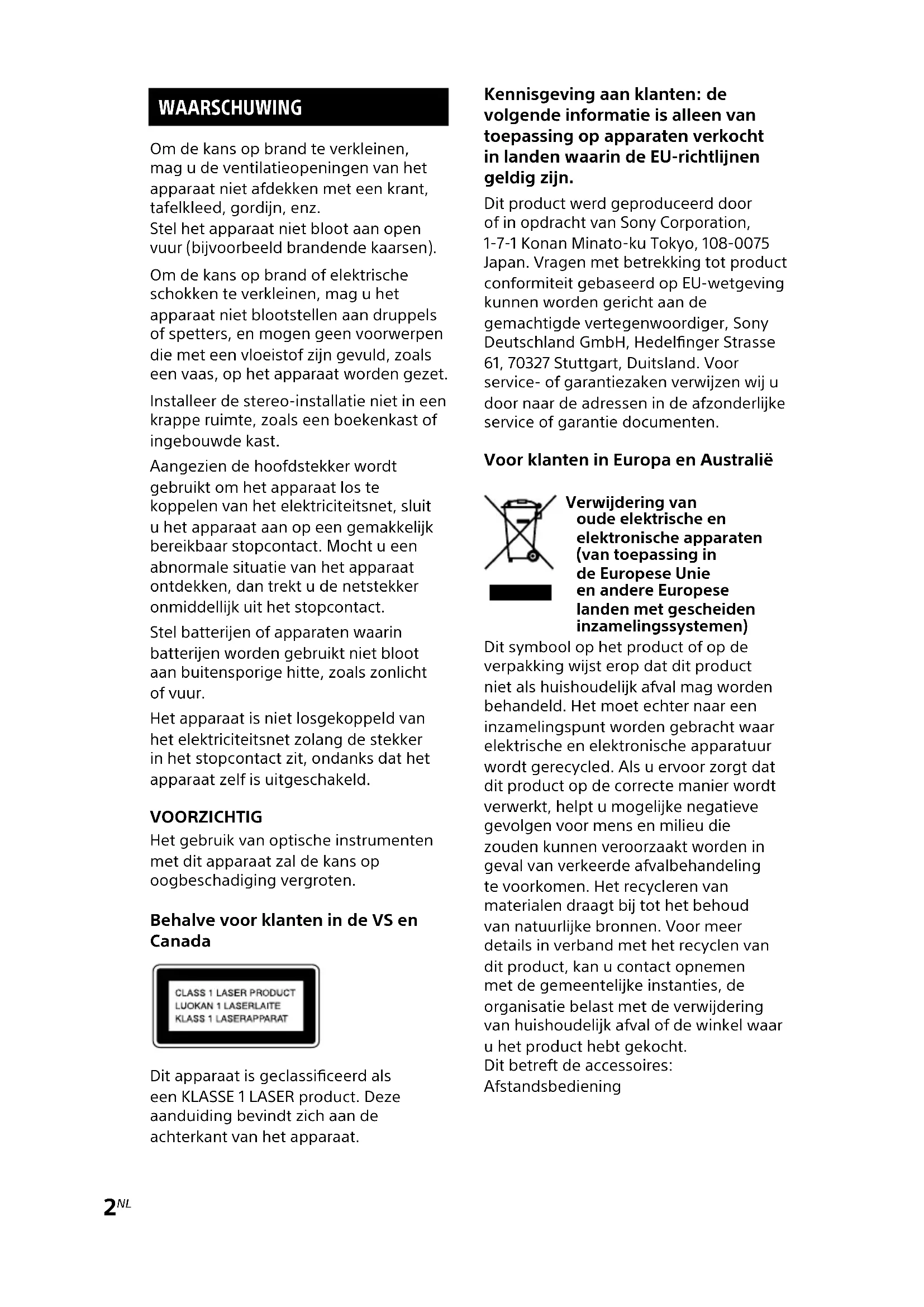 MHC-EC619iP.4-467-785-52(1) WAARSCHUWING Om de kans op brand te verkleinen, mag u de ventilatieopeningen van het apparaat niet afdekken met een krant, tafelkleed, gordn, enz. Stel het apparaat niet bloot aan open vuur (bvoorbeeld brandende kaarsen). Om de kans op brand of elektrische schokken te verkleinen, mag u het apparaat niet blootstellen aan druppels of spetters, en mogen geen voorwerpen die met een vloeistof zn gevuld, zoals een vaas, op het apparaat worden gezet. Installeer de stereo-installatie niet in een krappe ruimte, zoals een boekenkast of ingebouwde kast. Aangezien de hoofdstekker wordt gebruikt om het apparaat los te koppelen van het elektriciteitsnet, sluit u het apparaat aan op een gemakkelk bereikbaar stopcontact. Mocht u een abnormale situatie van het apparaat ontdekken, dan trekt u de netstekker onmiddellk uit het stopcontact. Stel batteren of apparaten waarin batteren worden gebruikt niet bloot aan buitensporige hitte, zoals zonlicht of vuur. Het apparaat is niet losgekoppeld van het elektriciteitsnet zolang de stekker in het stopcontact zit, ondanks dat het apparaat zelf is uitgeschakeld. VOORZICHTIG Het gebruik van optische instrumenten met dit apparaat zal de kans op oogbeschadiging vergroten. Behalve voor klanten in de VS en Canada Dit apparaat is geclassiceerd als een KLASSE 1 LASER product. Deze aanduiding bevindt zich aan de achterkant van het apparaat. Kennisgeving aan klanten: de volgende informatie is alleen van toepassing op apparaten verkocht in landen waarin de EU-richtlnen geldig zn. Dit product werd geproduceerd door of in opdracht van Sony Corporation, 1-7-1 Konan Minato-ku Tokyo, 108-0075 Japan. Vragen met betrekking tot product conformiteit gebaseerd op EU-wetgeving kunnen worden gericht aan de gemachtigde vertegenwoordiger, Sony Deutschland GmbH, Hedelnger Strasse 61, 70327 Stuttgart, Duitsland. Voor service- of garantiezaken verwzen w u door naar de adressen in de afzonderlke service of garantie documenten. Voor klanten in Europa en Australië Verwdering van oude elektrische en elektronische apparaten (van toepassing in de Europese Unie en andere Europese landen met gescheiden inzamelingssystemen) Dit symbool op het product of op de verpakking wst erop dat dit product niet als huishoudelk afval mag worden behandeld. Het moet echter naar een inzamelingspunt worden gebracht waar elektrische en elektronische apparatuur wordt gerecycled. Als u ervoor zorgt dat dit product op de correcte manier wordt verwerkt, helpt u mogelke negatieve gevolgen voor mens en milieu die zouden kunnen veroorzaakt worden in geval van verkeerde afvalbehandeling te voorkomen. Het recycleren van materialen draagt b tot het behoud van natuurlke bronnen. Voor meer details in verband met het recyclen van dit product, kan u contact opnemen met de gemeentelke instanties, de organisatie belast met de verwdering van huishoudelk afval of de winkel waar u het product hebt gekocht. Dit betreft de accessoires: Afstandsbediening3