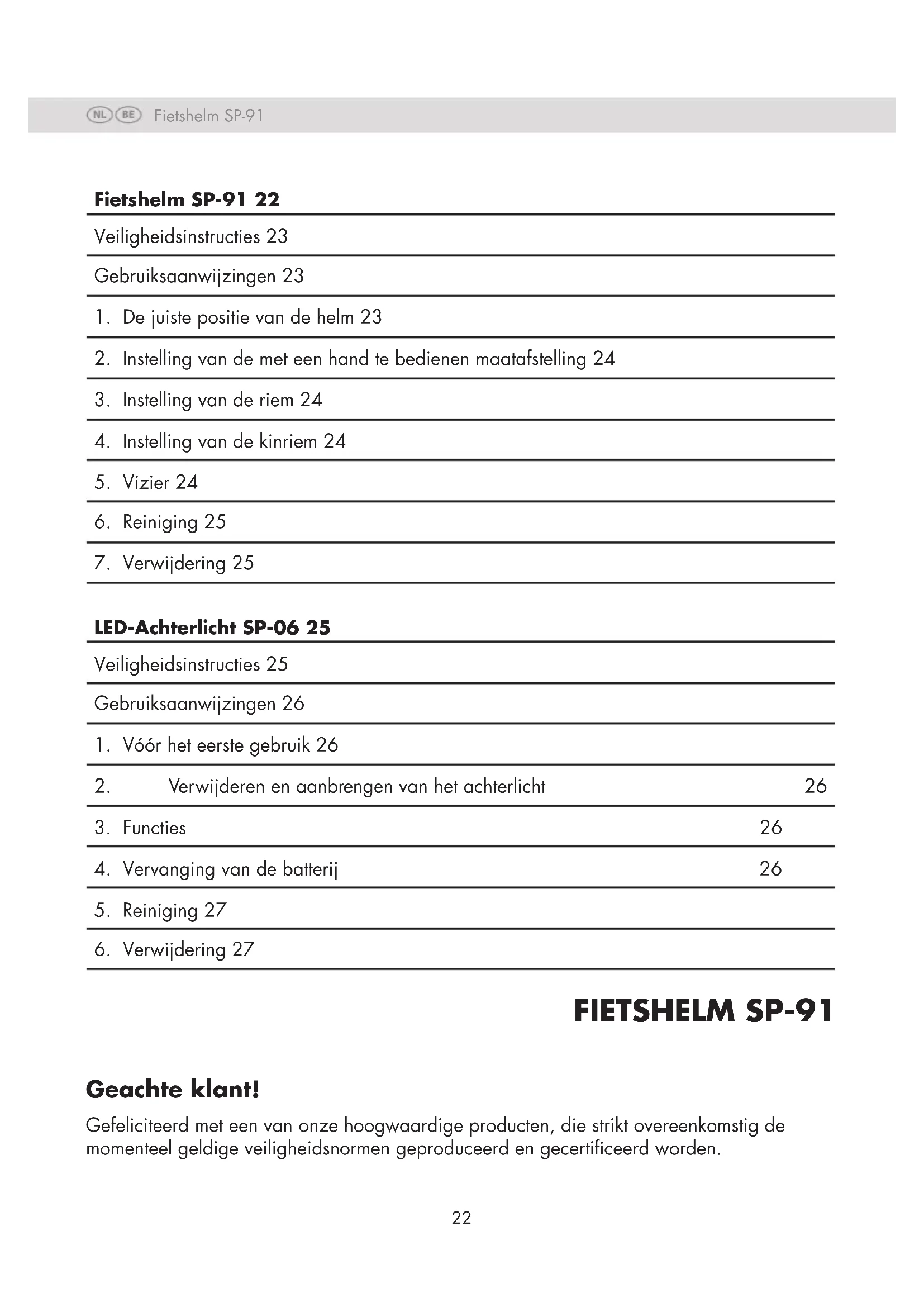 - Laat de afgedankte helm verwerken via een erkend afvalverwerkingsbedrijf of via een gemeentelijke instelling voor afvalverwerking. LED-ACHTERLICHT SP-06 Veiligheidsinstructies