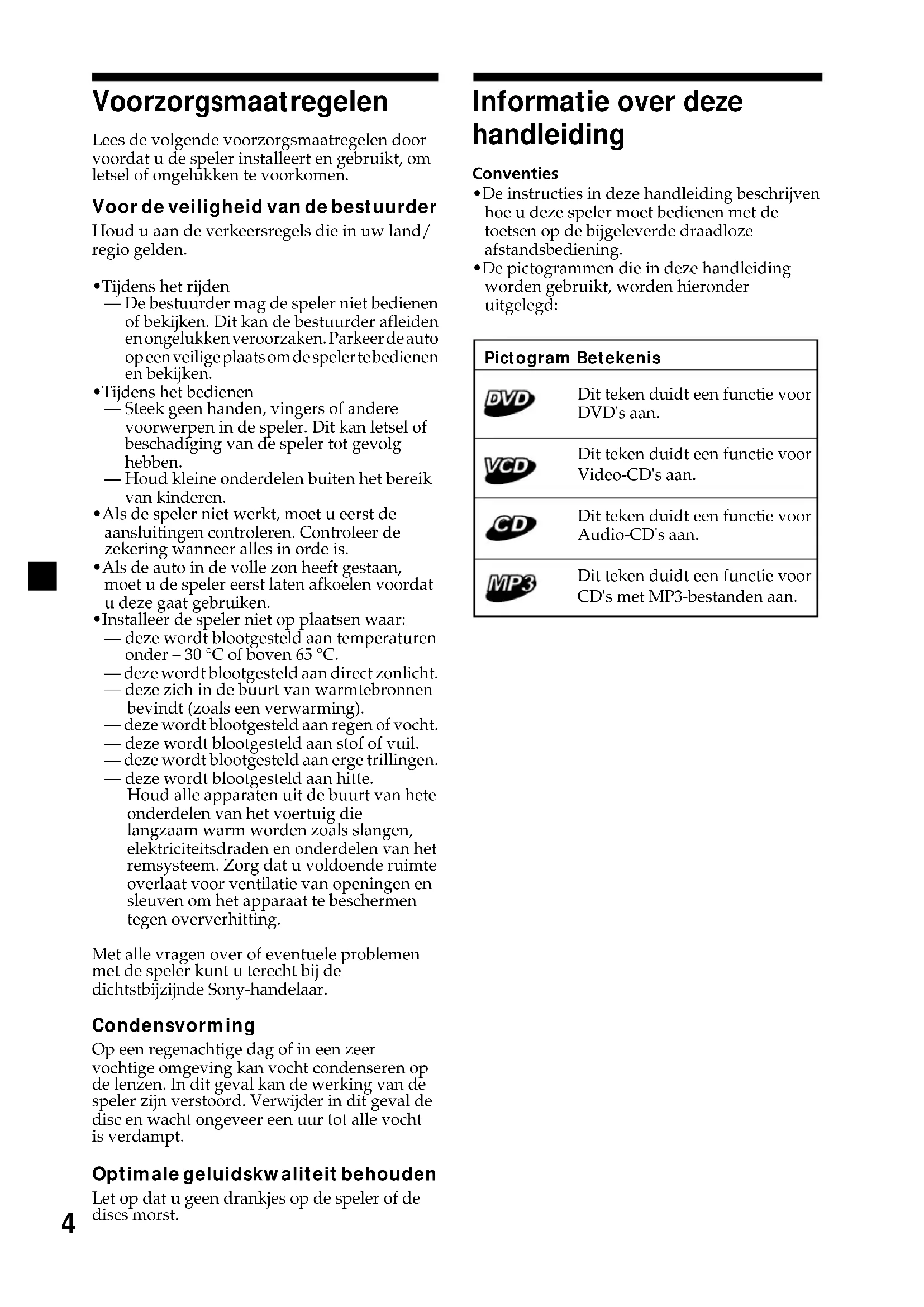 - Installeer de speler niet op plaatsen waar: — deze wordt blootgesteld aan temperaturen onder – 30 °C of boven 65 °C. — deze wordt blootgesteld aan direct zonlicht. — deze zich in de buurt van warmtebronnen bevindt (zoals een verwarming). — deze wordt blootgesteld aan regen of vocht. — deze wordt blootgesteld aan stof of vuil. — deze wordt blootgesteld aan erge trillingen. — deze wordt blootgesteld aan hitte. Houd alle apparaten uit de buurt van hete onderdelen van het voertuig die langzaam warm worden zoals slangen, elektriciteitsdraden en onderdelen van het remsysteem. Zorg dat u voldoende ruimte overlaat voor ventilatie van openingen en sleuven om het apparaat te beschermen tegen oververhitting. Met alle vragen over of eventuele problemen met de speler kunt u terecht bij de dichtstbijzijnde Sony-handelaar. Condensvorming Op een regenachtige dag of in een zeer vochtige omgeving kan vocht condenseren op de lenzen. In dit geval kan de werking van de speler zijn verstoord. Verwijder in dit geval de disc en wacht ongeveer een uur tot alle vocht is verdampt. Optimale geluidskwaliteit behouden Let op dat u geen drankjes op de speler of de discs morst. Informatie over deze handleiding Conventies