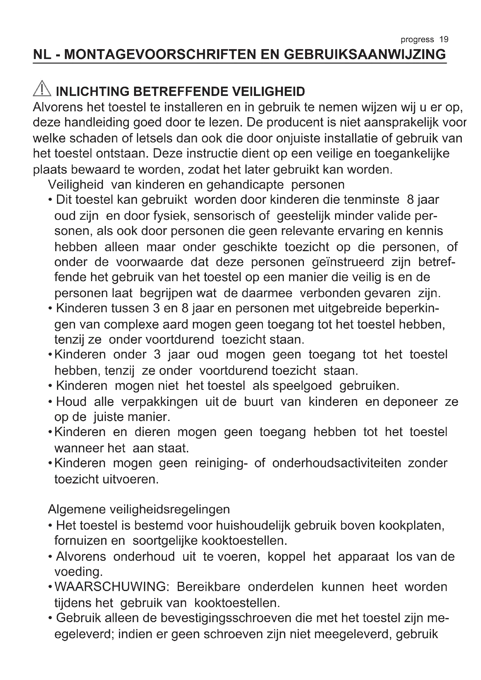 - Gebruik alleen de bevestigingsschroeven die met het toestel zijn me- egeleverd; indien er geen schroeven zijn niet meegeleverd, gebruik20 progress de schroeven die in de installatie instructie aanbevolen worden.